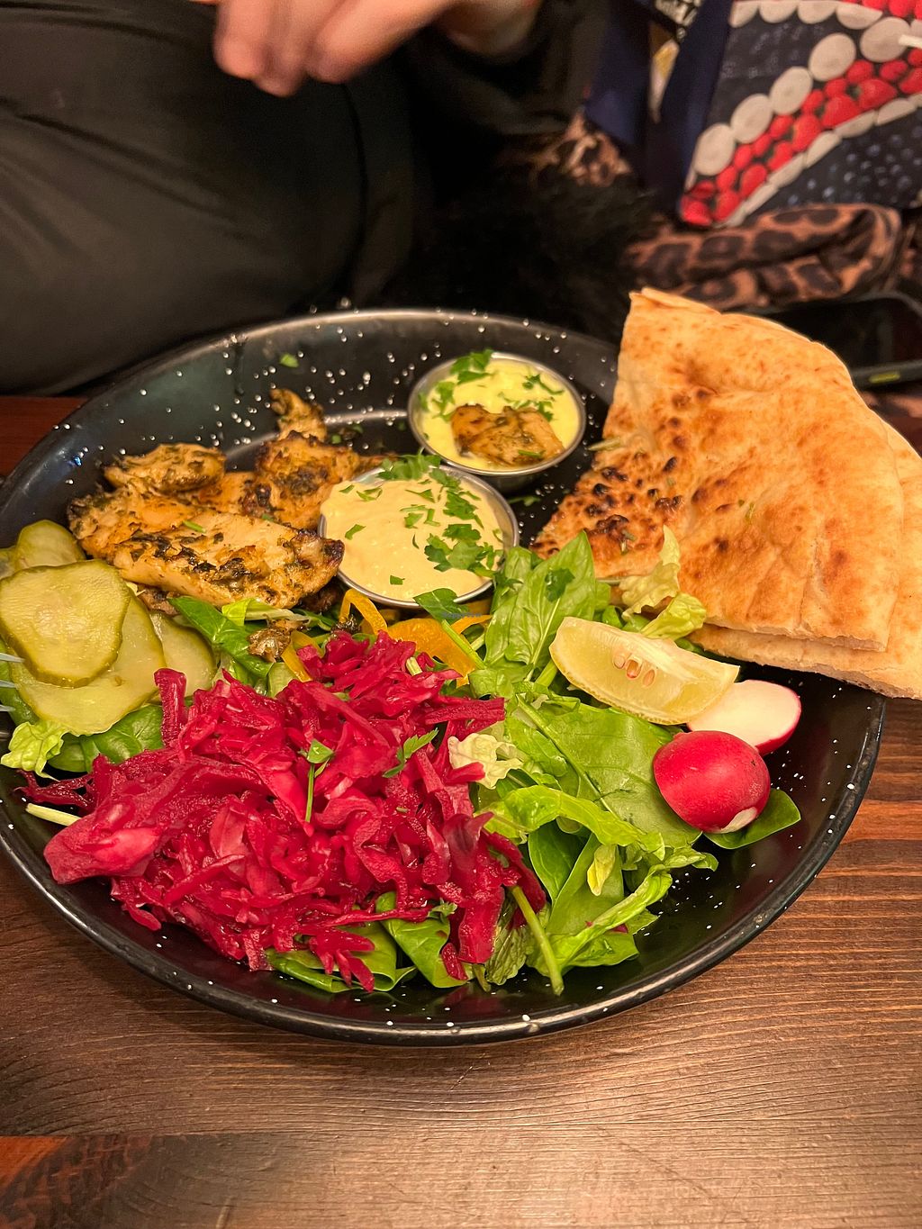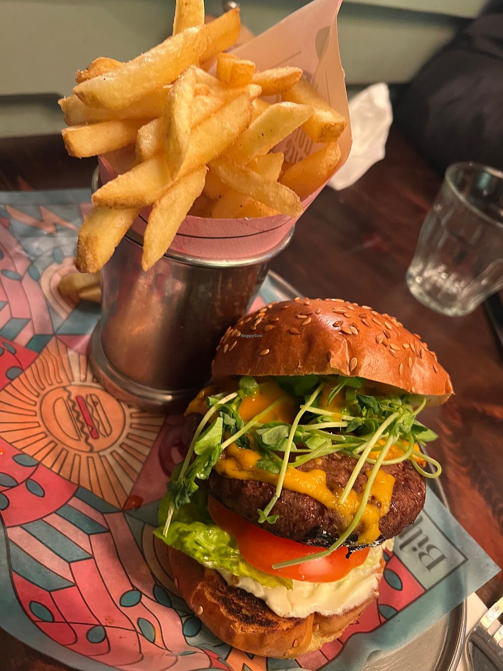 I choose the vegan burger with fries. Actually really good with a truffle and chilli chipotle. My mother in law had the veggie ancient grain bowl and she really liked it.