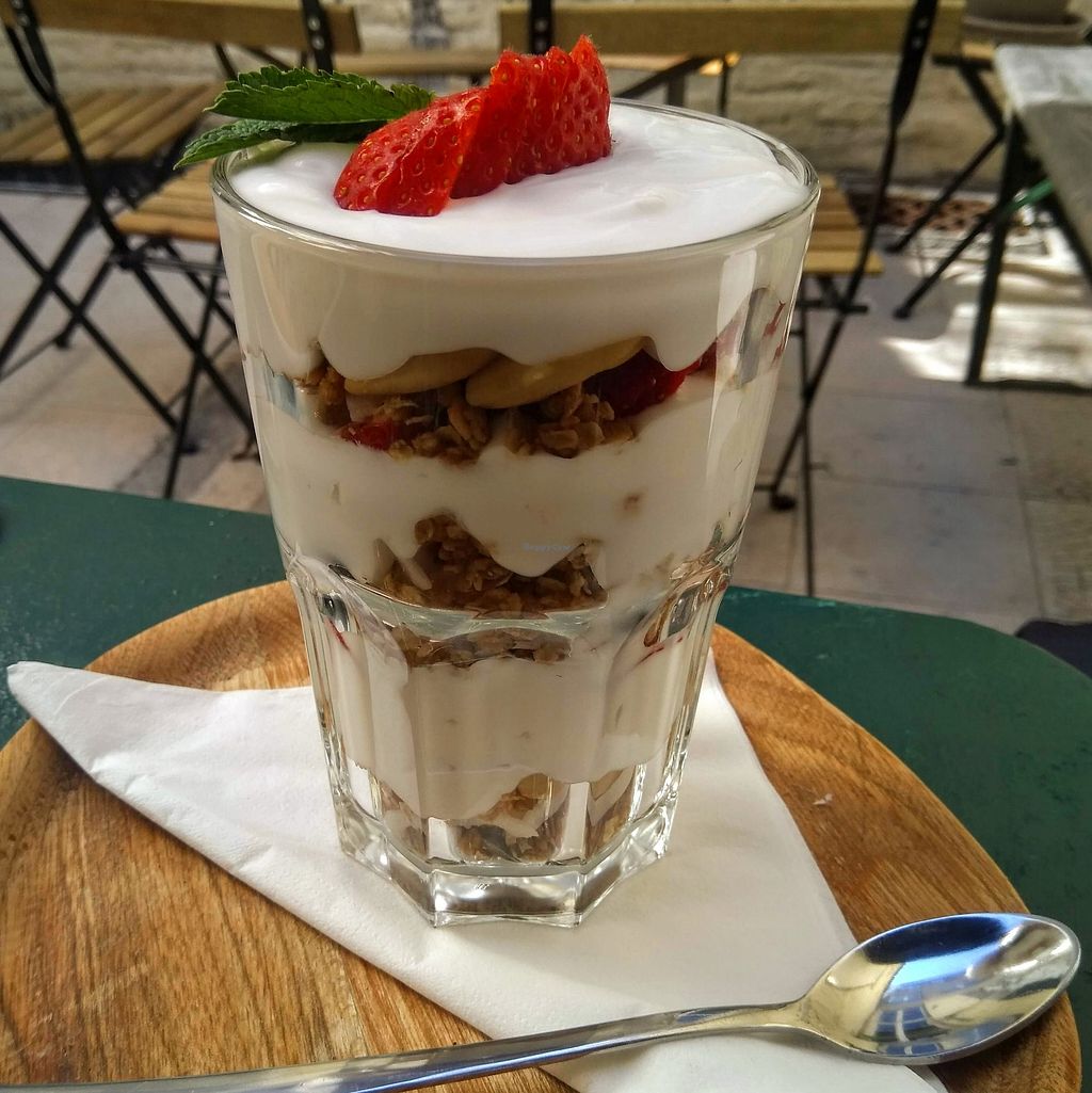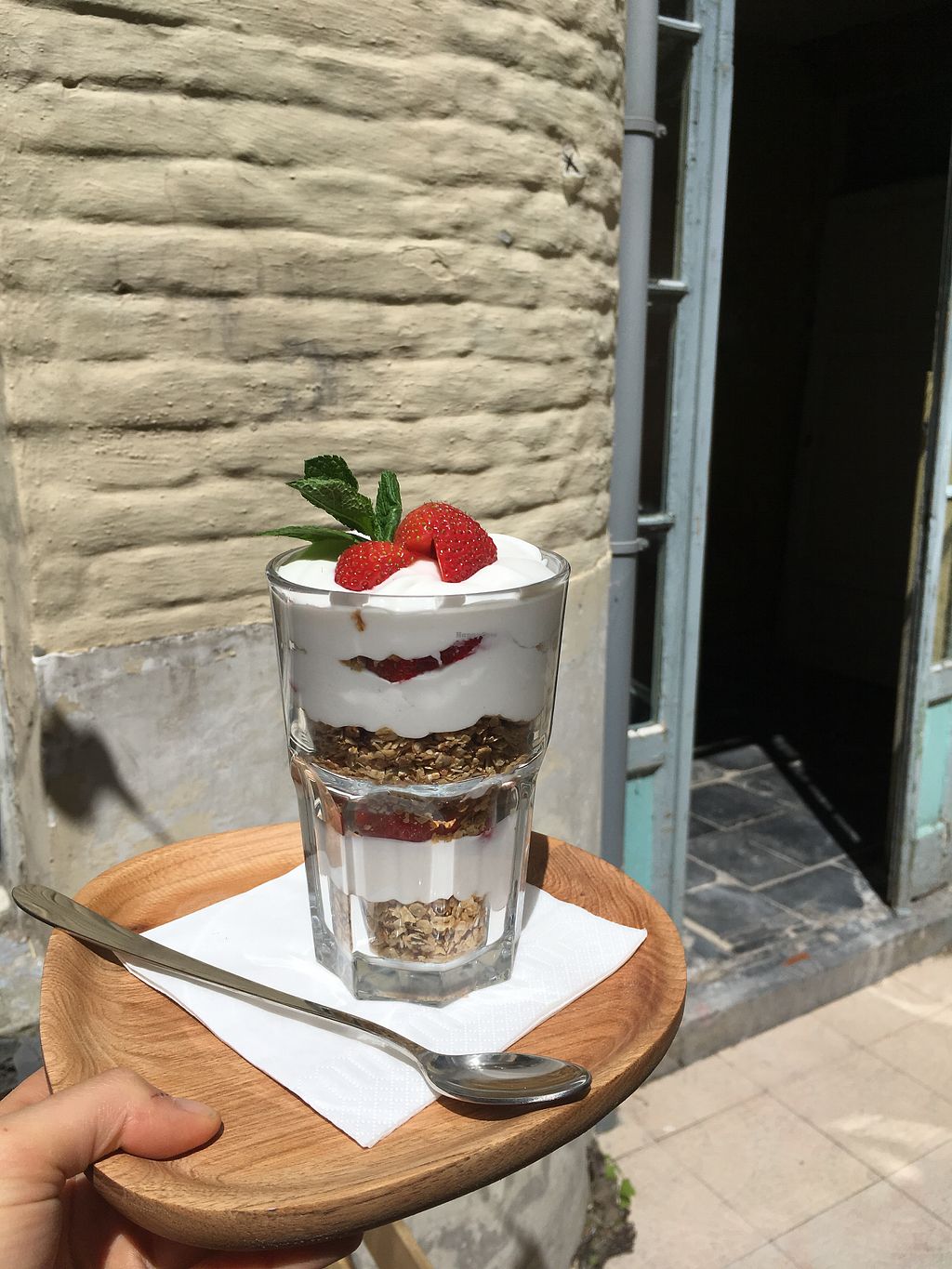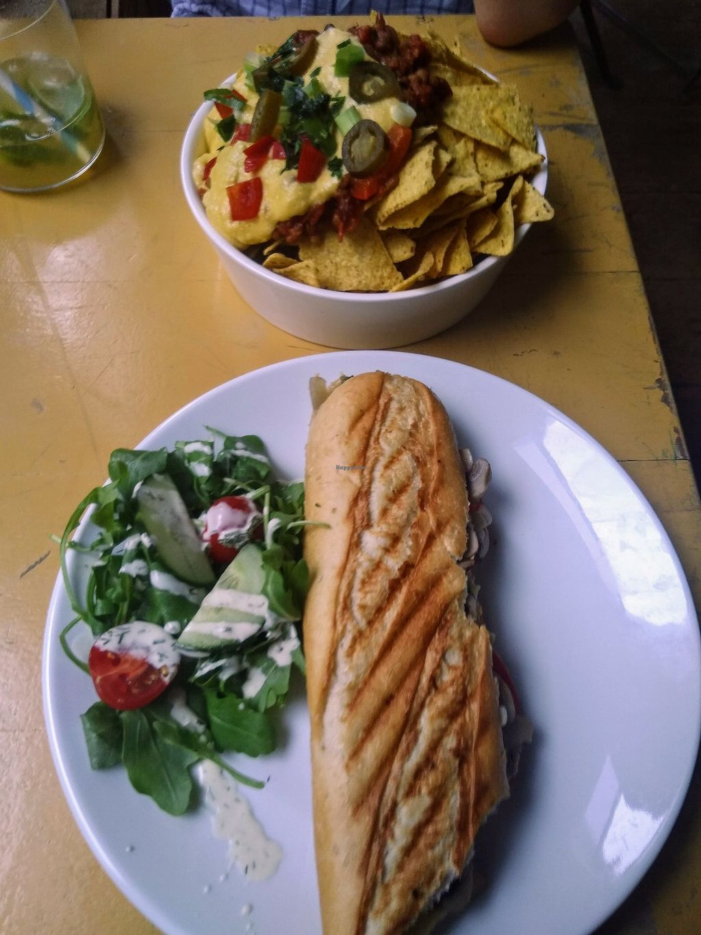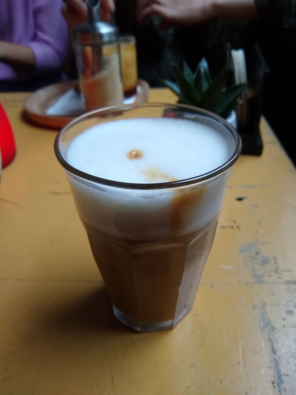 Ice coffee, nachos, latte and a cappuccino with whipped cream