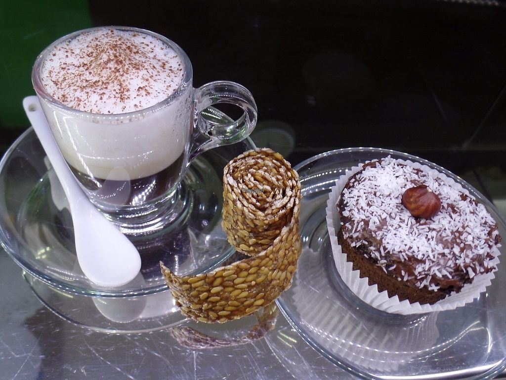 Marocchino con latte vegetale,rotolino crudista e muffin al cioccolato…