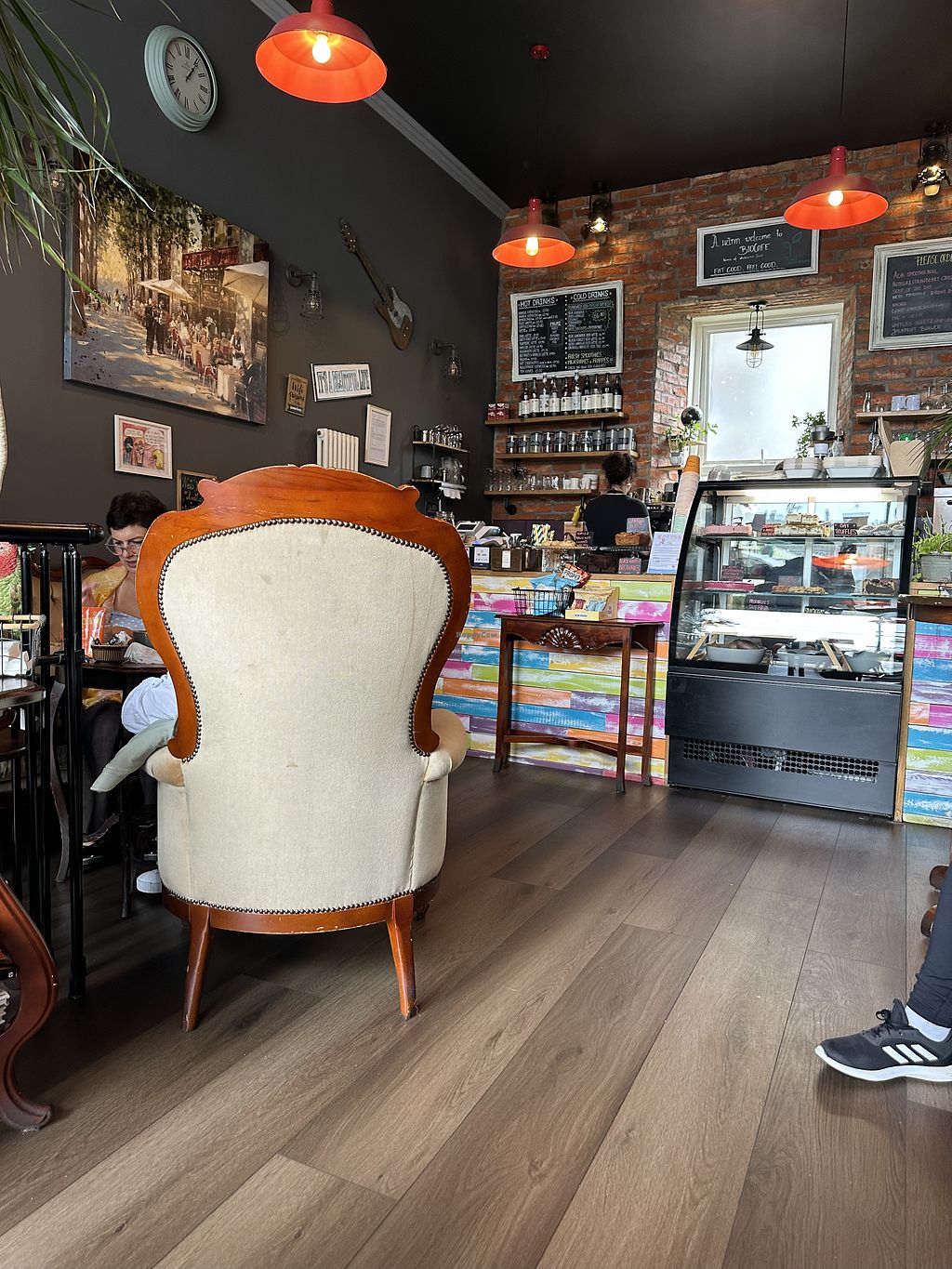 Been here for lunch quite a few times. There’s several small tables upstairs plus window seats or go down the spiral staircase to the basement where there’s one very large table and a couple of smaller ones. Lots of options including breakfast, wraps, tacos, waffles, buddha bowls and smoothies. Their waffles are amazing- both sweet and savoury. My favourite is the mushroom and avocado which comes with chickpeas and tahini dressing, yumyum! Lots of vegan and gluten free cakes too. Also look for the wee daily specials board beside the till.