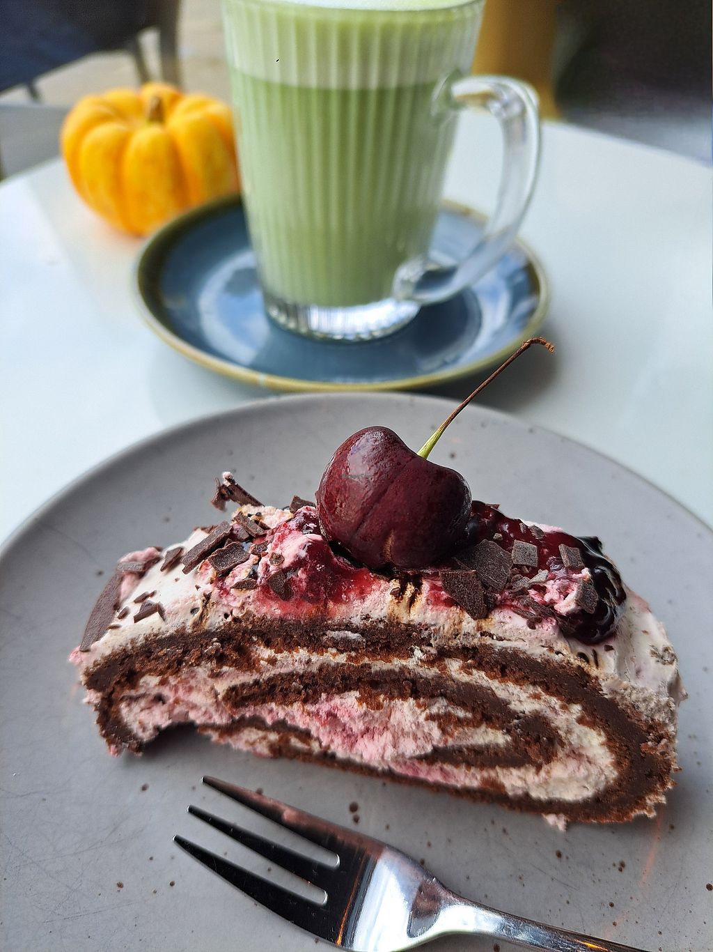 Colourful and fabulous decor and amazing array of cakes on offer at this amazing wee place. I went for mango matcha 'cheesecake' and my usual decaf oat latte, absolutely delicious.