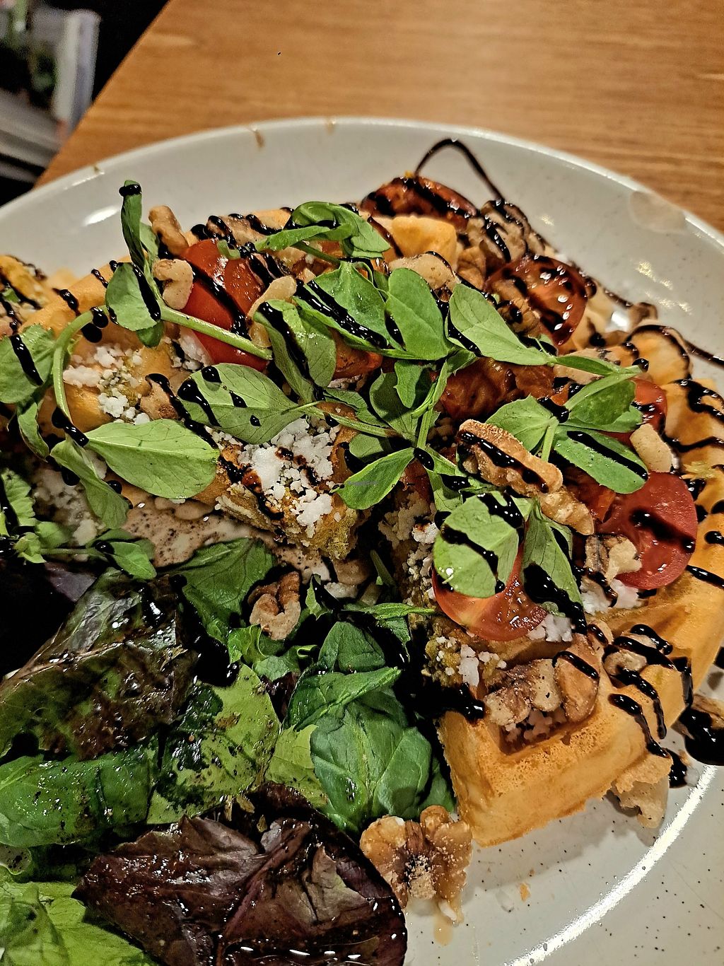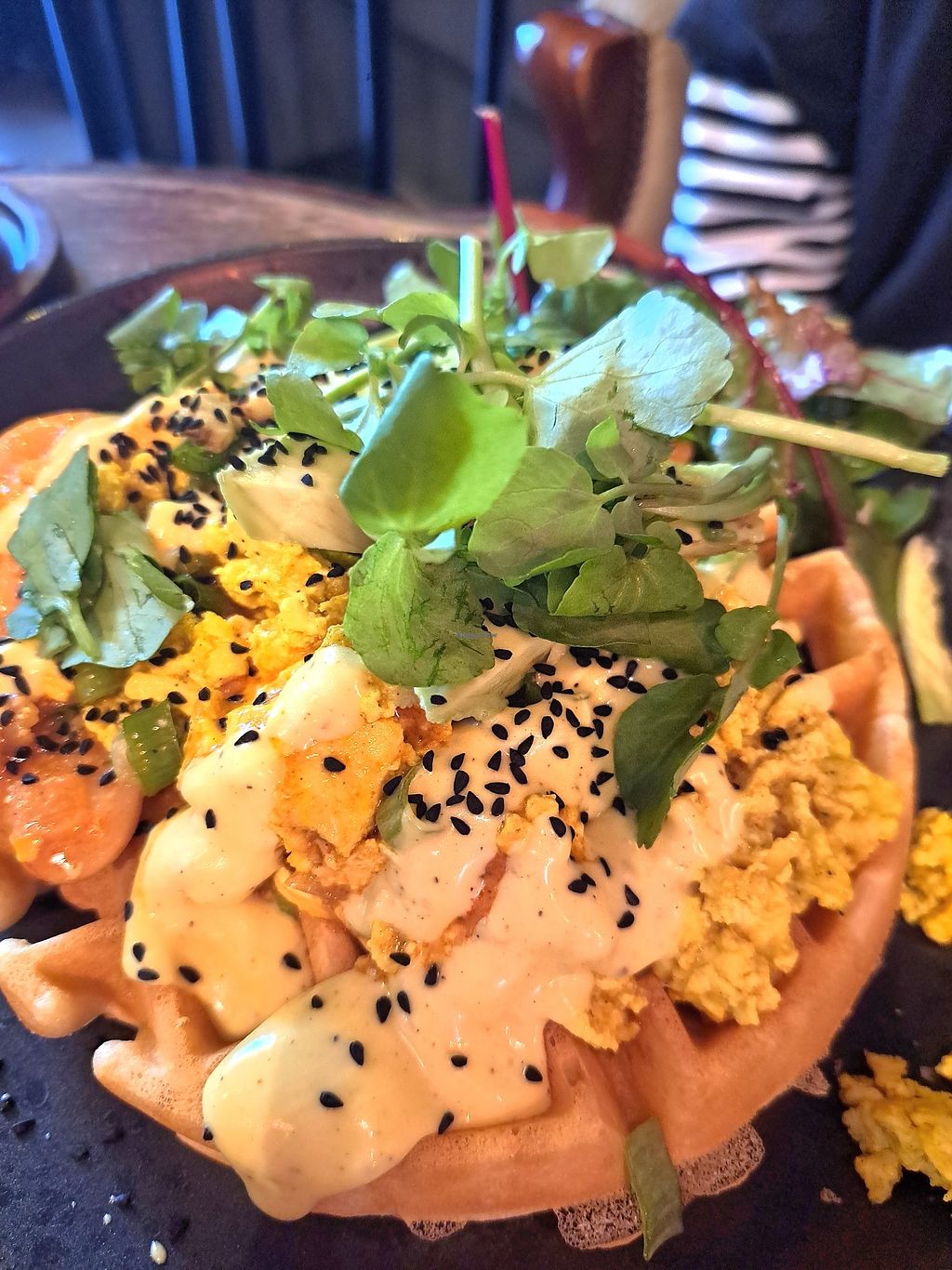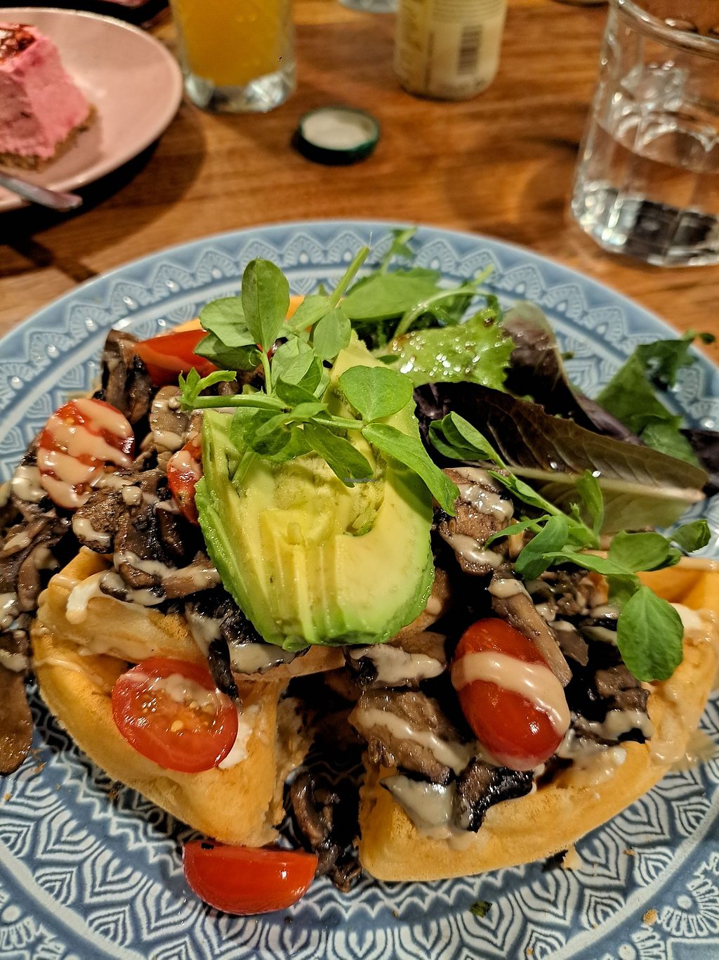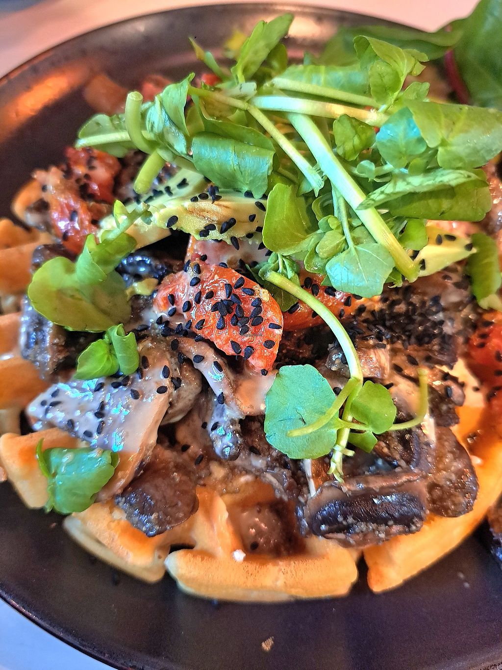 Read more** update Sept’23 - new shape of waffles; rectangular now instead of round - smaller than before but still very filling and absolutely delicious. Today we had both the mushroom & avocado and the BBQ jackfruit. Both amazing 👌🏻 I’m already excited for my next visit where I’ll maybe try the Mediterranean with pesto & sun blushed tomatoes.