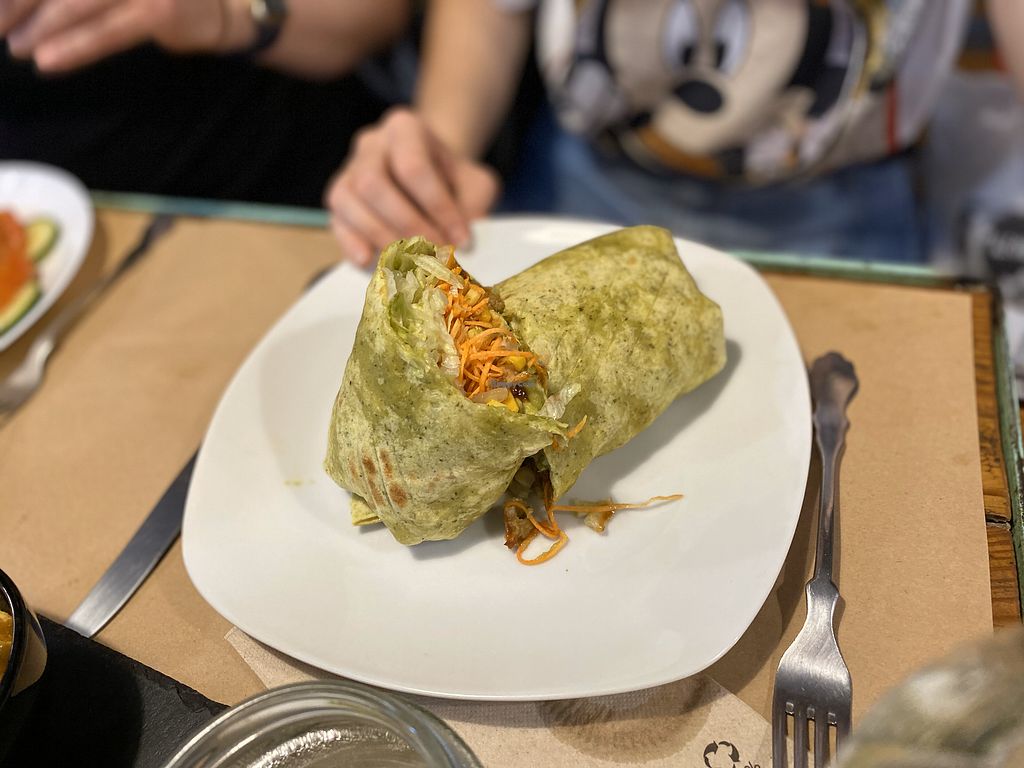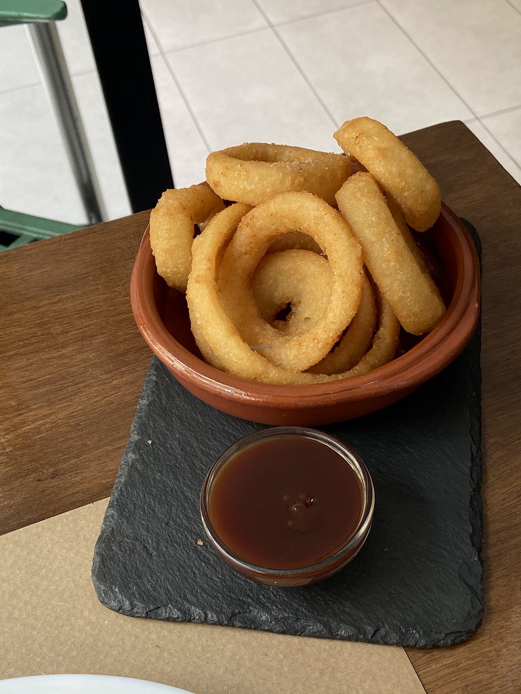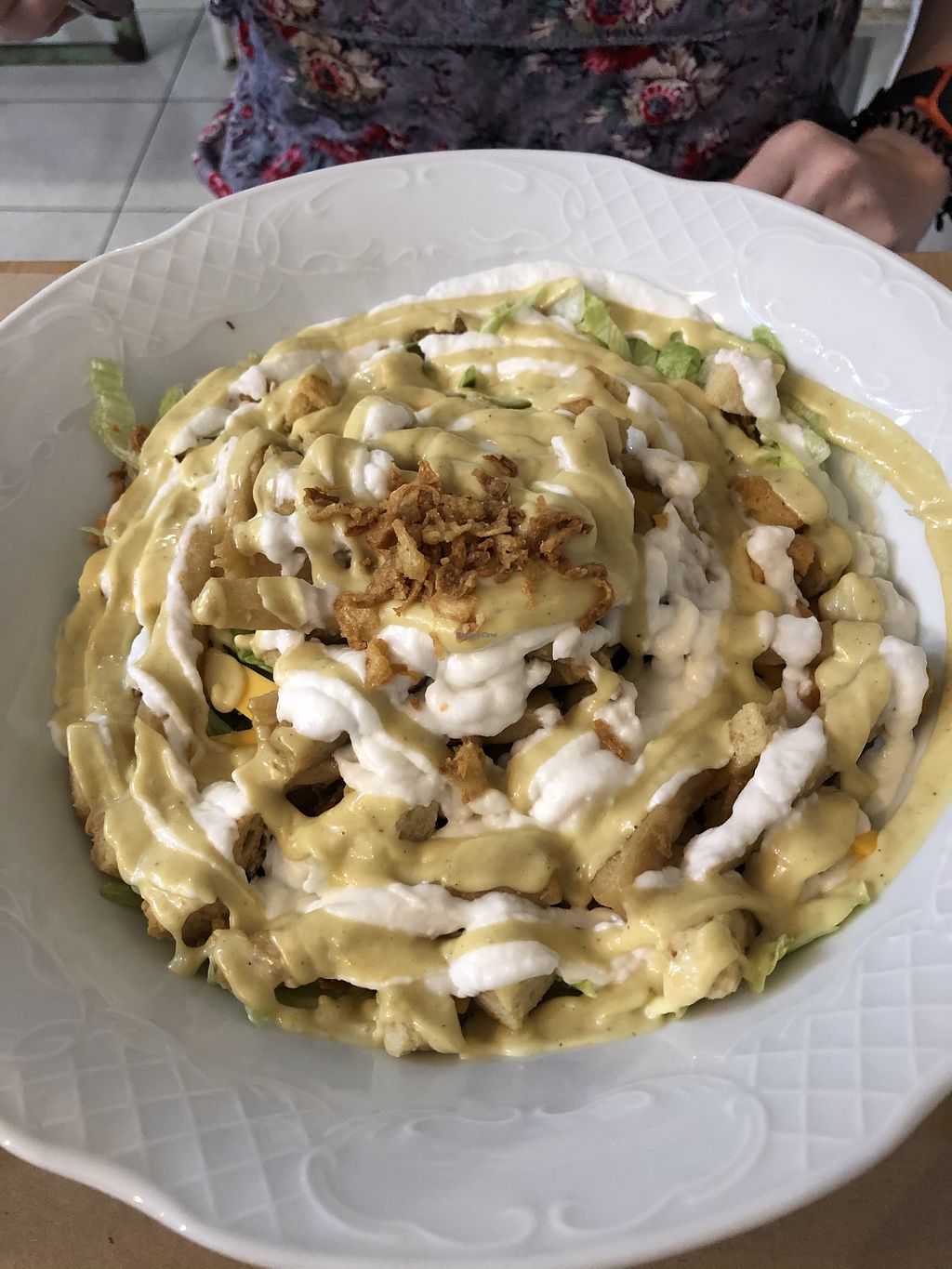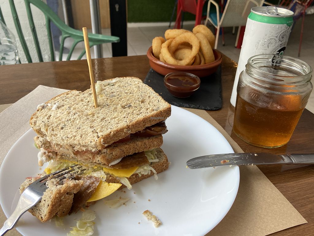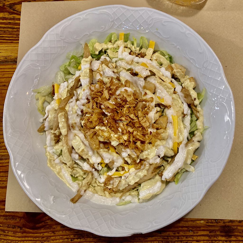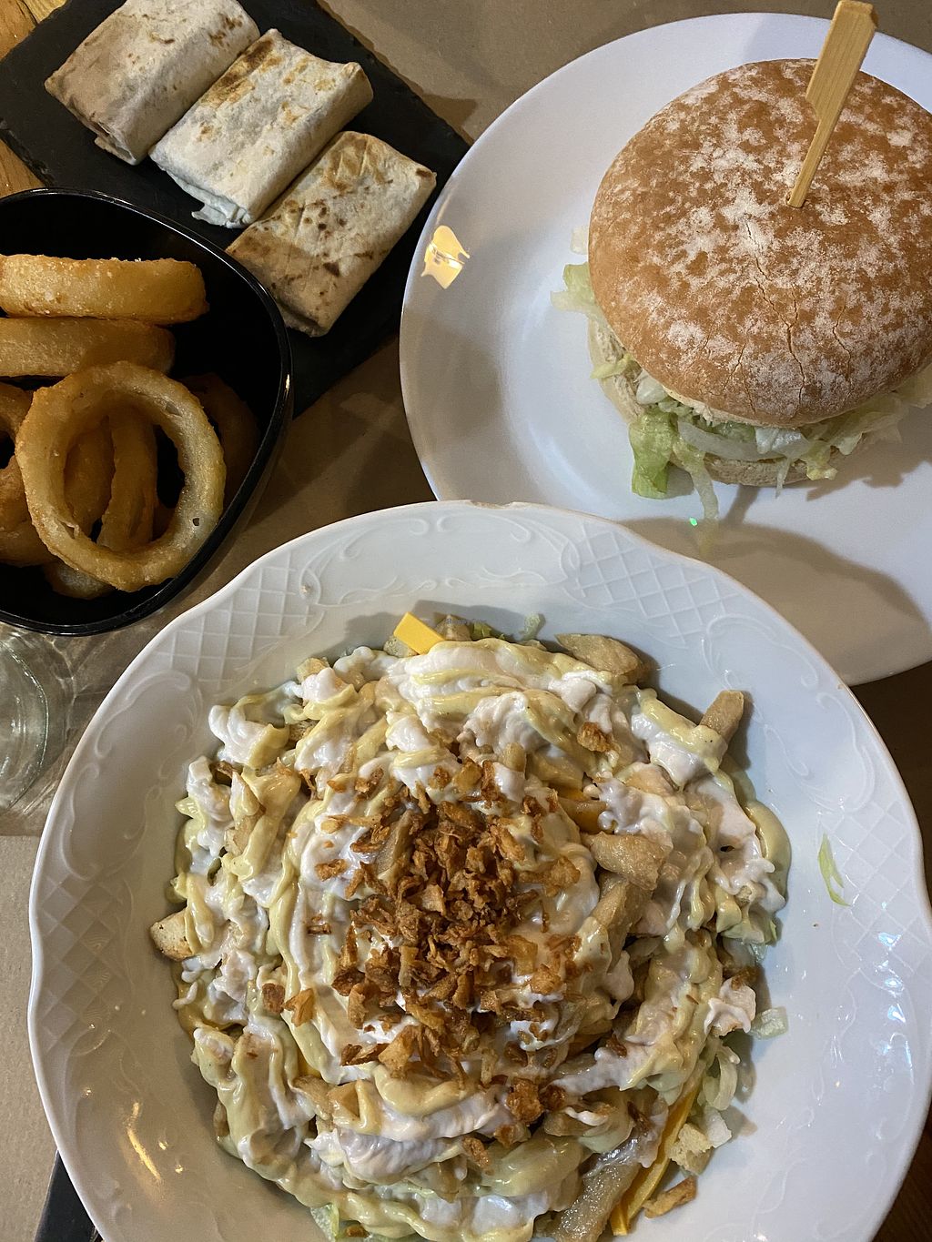 Onion rings, mini burrito’s, Caesar salat, chicken burger