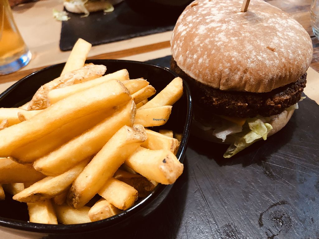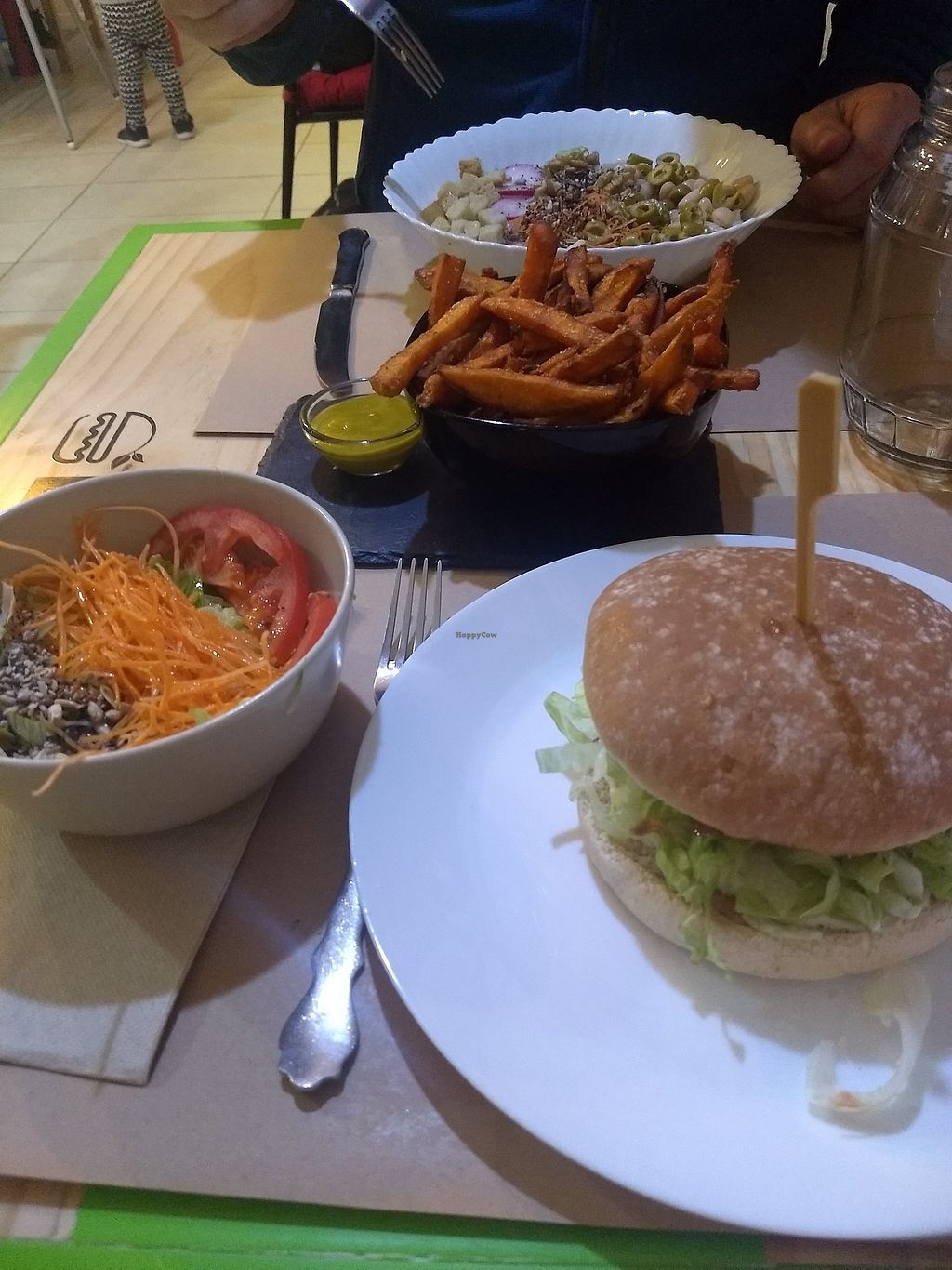 BBQ burger with side salad. Energy salad (large) in the distance with …