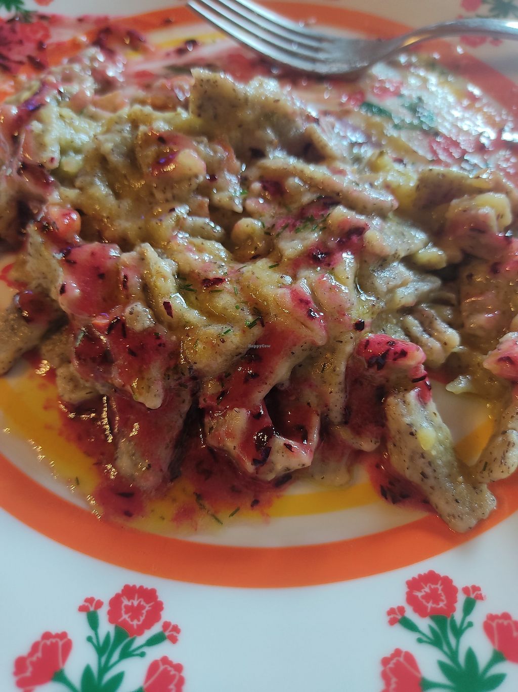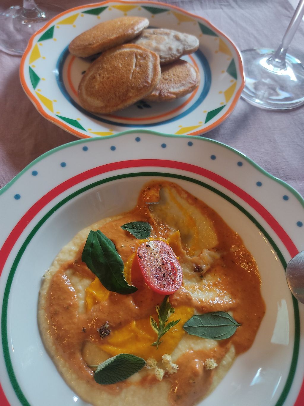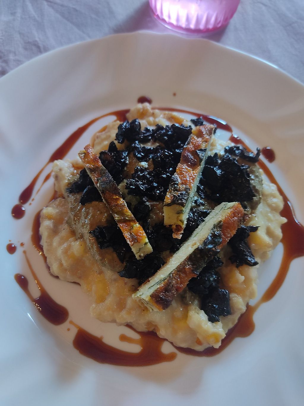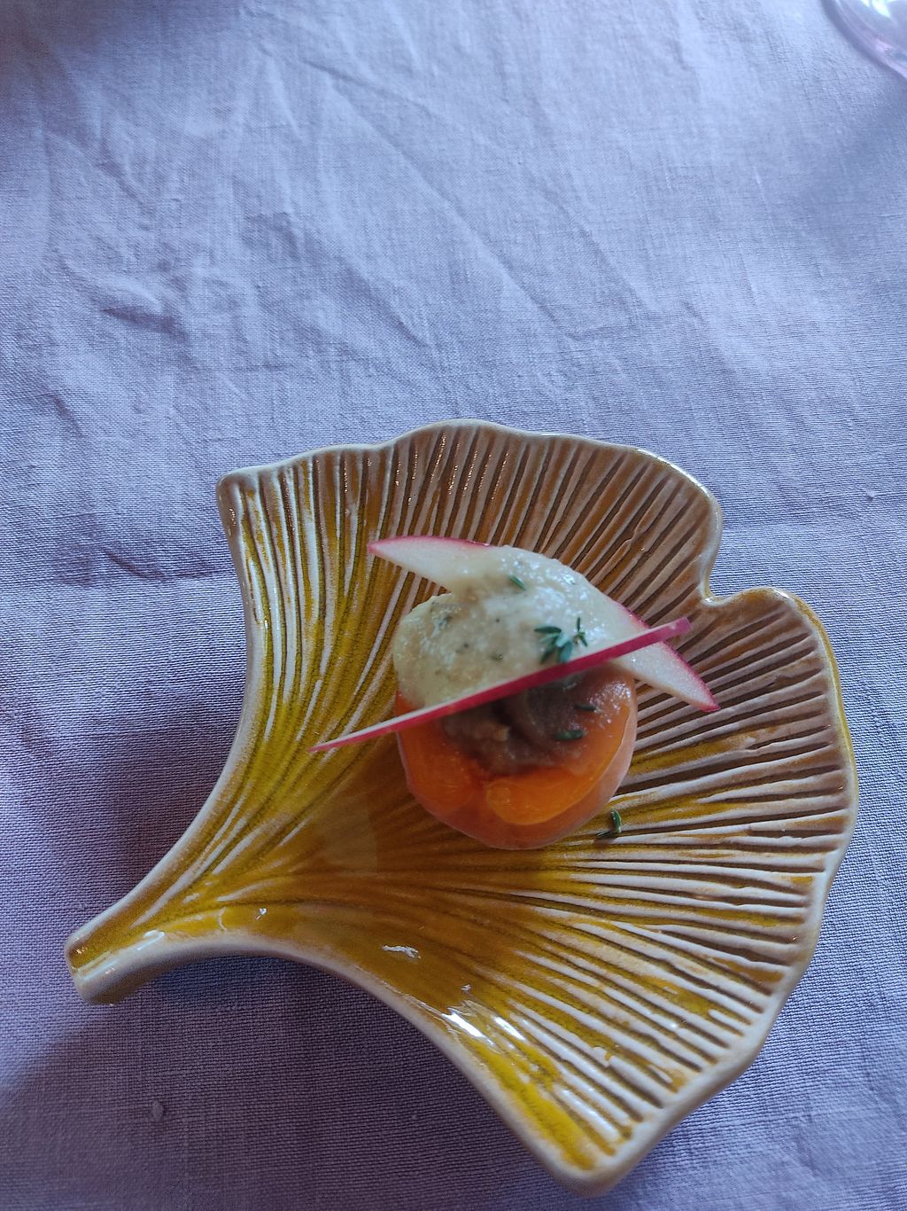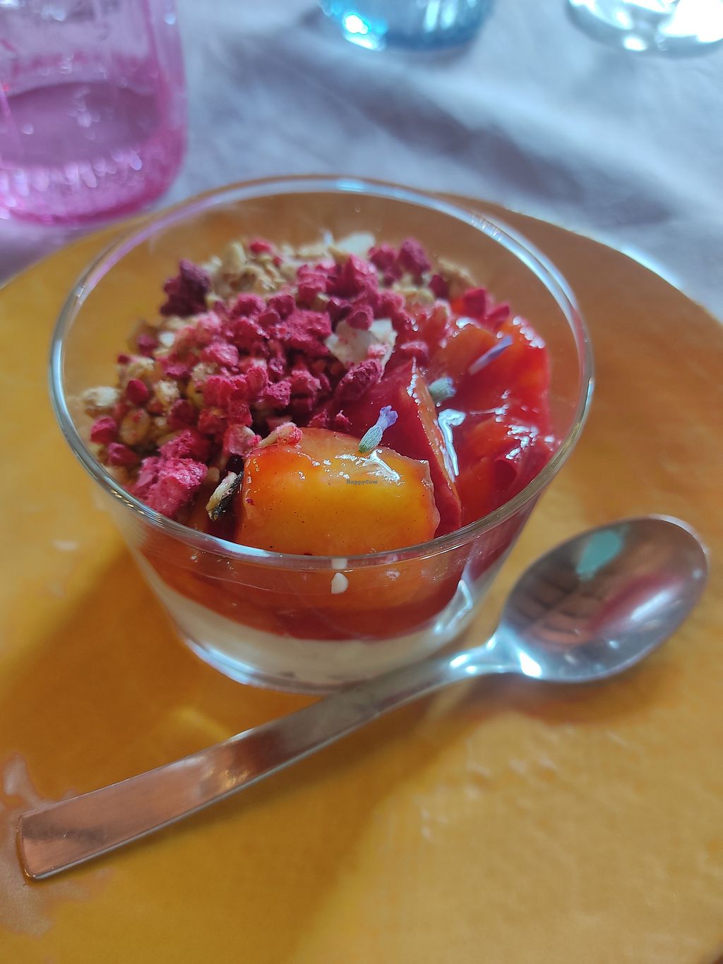 Chocolate torte and peach and raspberry mousse with almond cream and l…