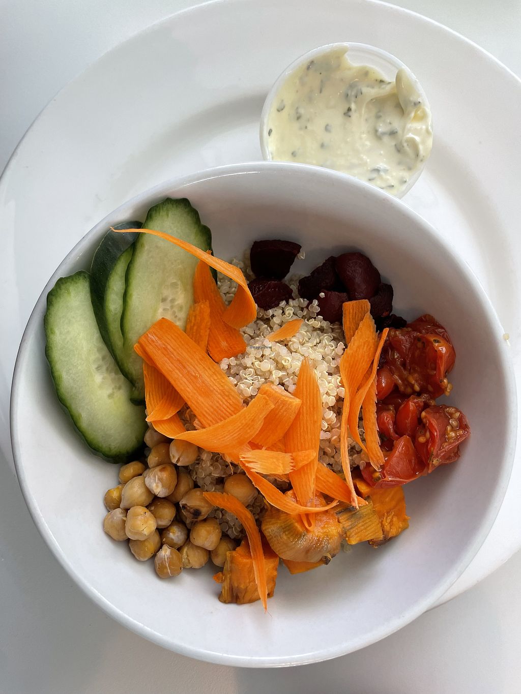 Lovely little cafe with a few vegan things on the menu including non dairy milk options and a Buddha bowl (very small portion though). Vegan oatmeal cookies were delicious!
