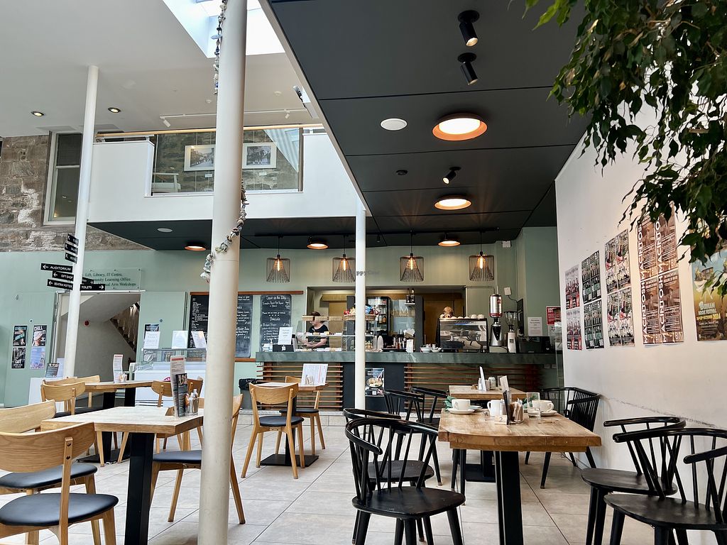 Serves meat, vegan options available. Modern, spacious cafe within a community arts venue. Small menu with clearly marked vegan dishes including avocado on sourdough, a sandwich and a toastie as well as vegan cakes. The soup is usually also vegan. Open Mon-Sun 10:00-16:00.
