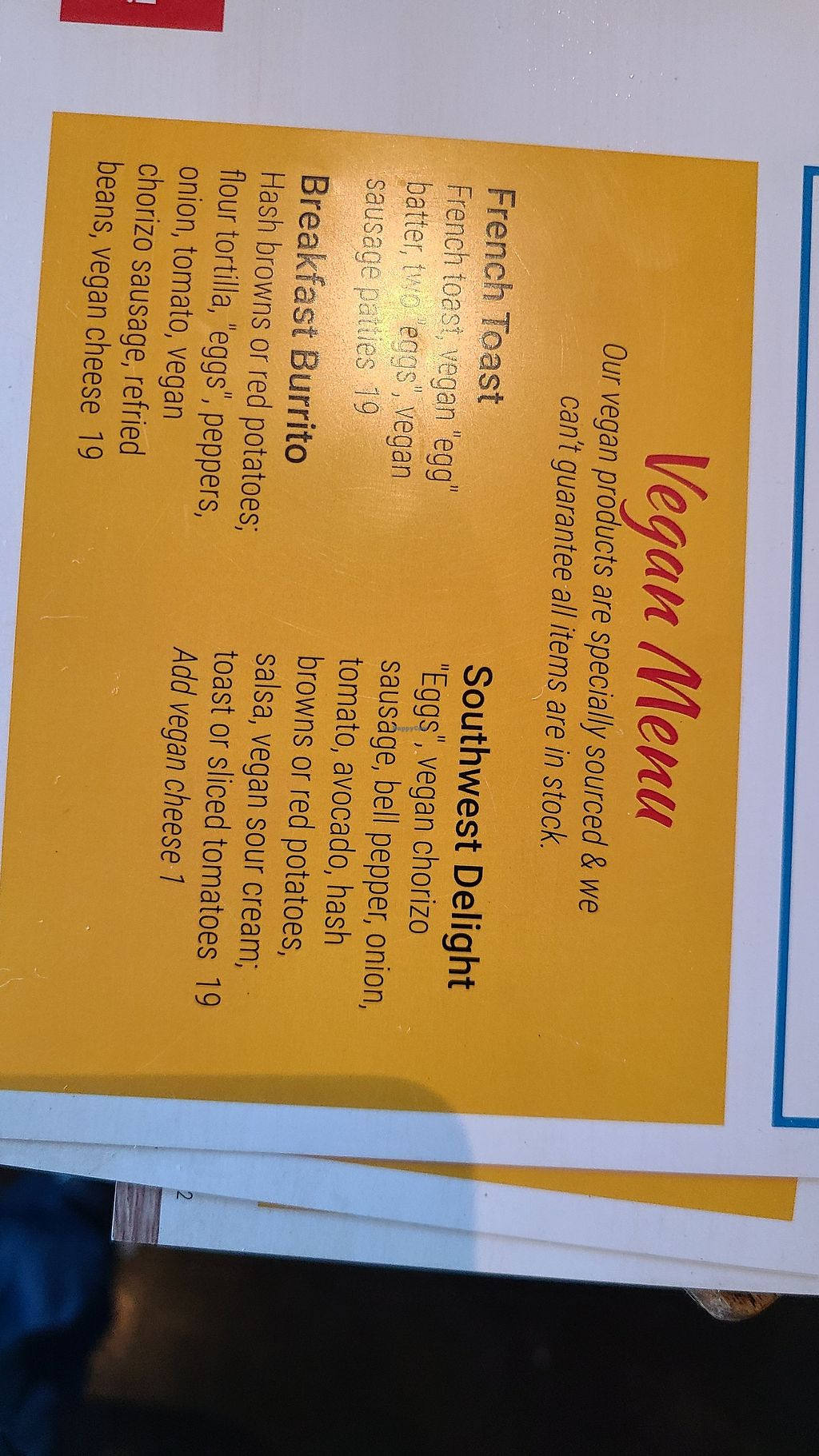 Three vegan options for breakfast! Pretty costly but quite delish! I had the southwest scramble that comes w taters or hashbrowns, toast, salsa, and vegan sour cream!