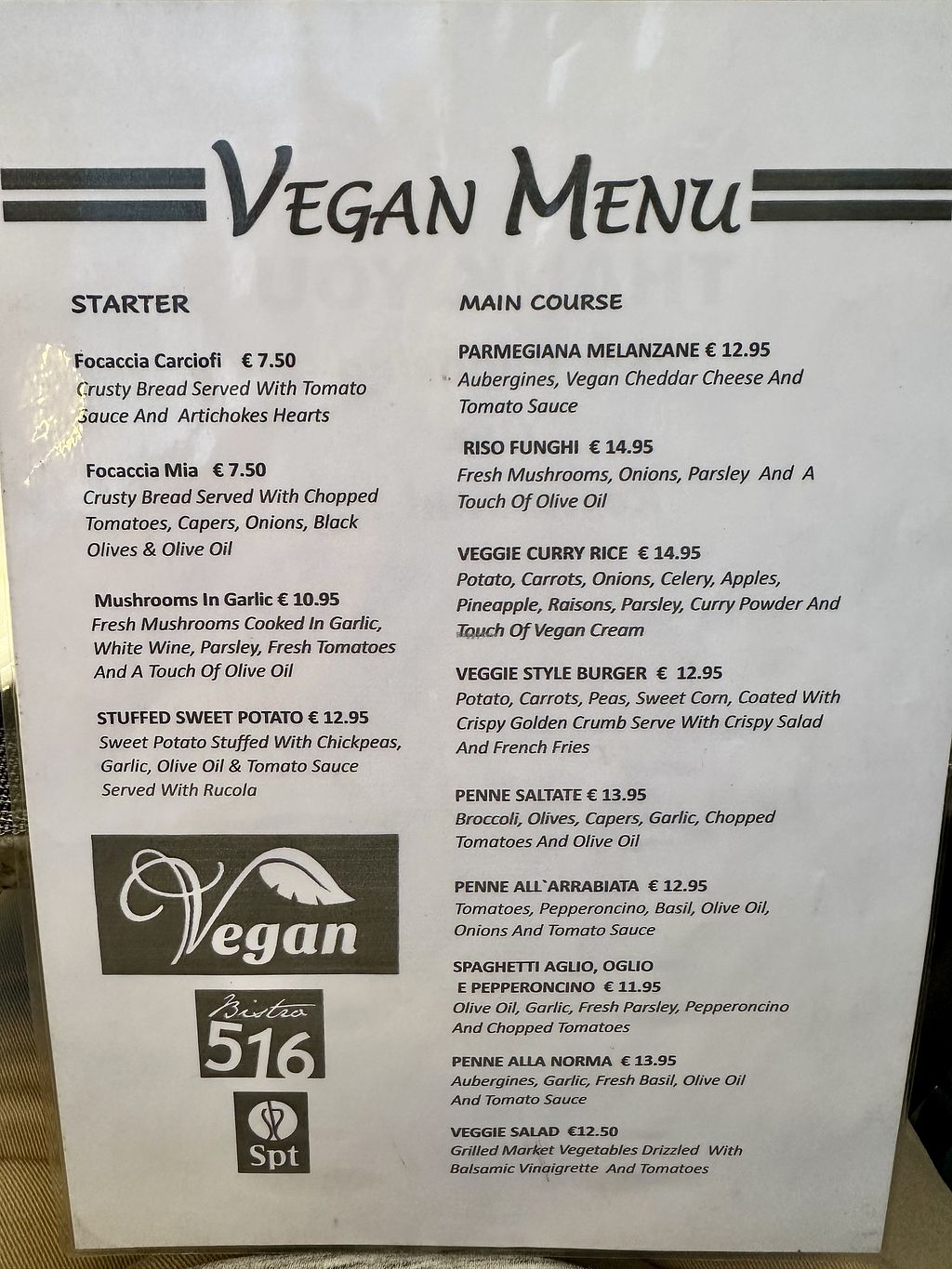 We visited this location next to the a cruise ship terminal in Valletta for a late evening meal with (non-vegan) friends. There was a separate menu for vegan options, offering a range of Italian style dishes to choose from. Staff were happy to serve the full range of dishes advertised, although the condiments (e.g., butter-alternatives with the complimentary bread) were not vegan.