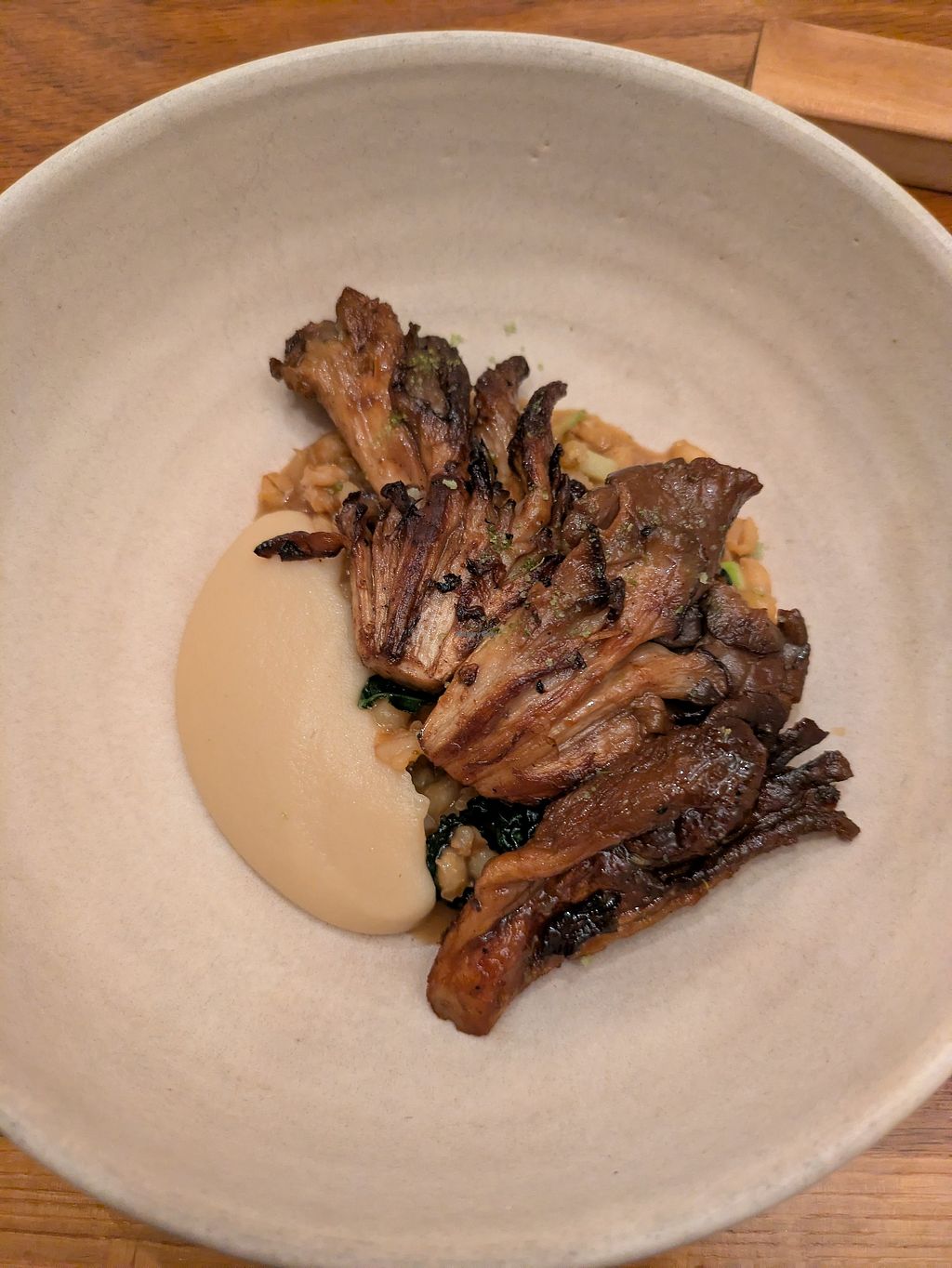 Read moreWe had the 5-course tasting menu with the addition of their locally grown Lupa Fried mushrooms. Courses when we visited included a balsamic tomato with soy cream cheese and rye bread pieces appetiser; starters of milk bread, white bean puree and harissa; roasted apricots and fried aubergine on top of a minty tabbouleh; a main course of arancini with pesto and barbequed mushrooms and lettuce with Caesar dressing; and a dessert of elderflower ice cream with mixed berry coulis and mixed grain crumb.