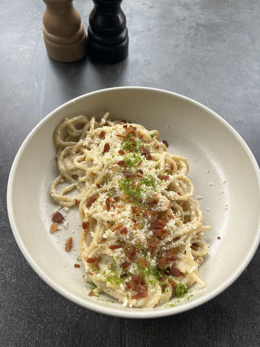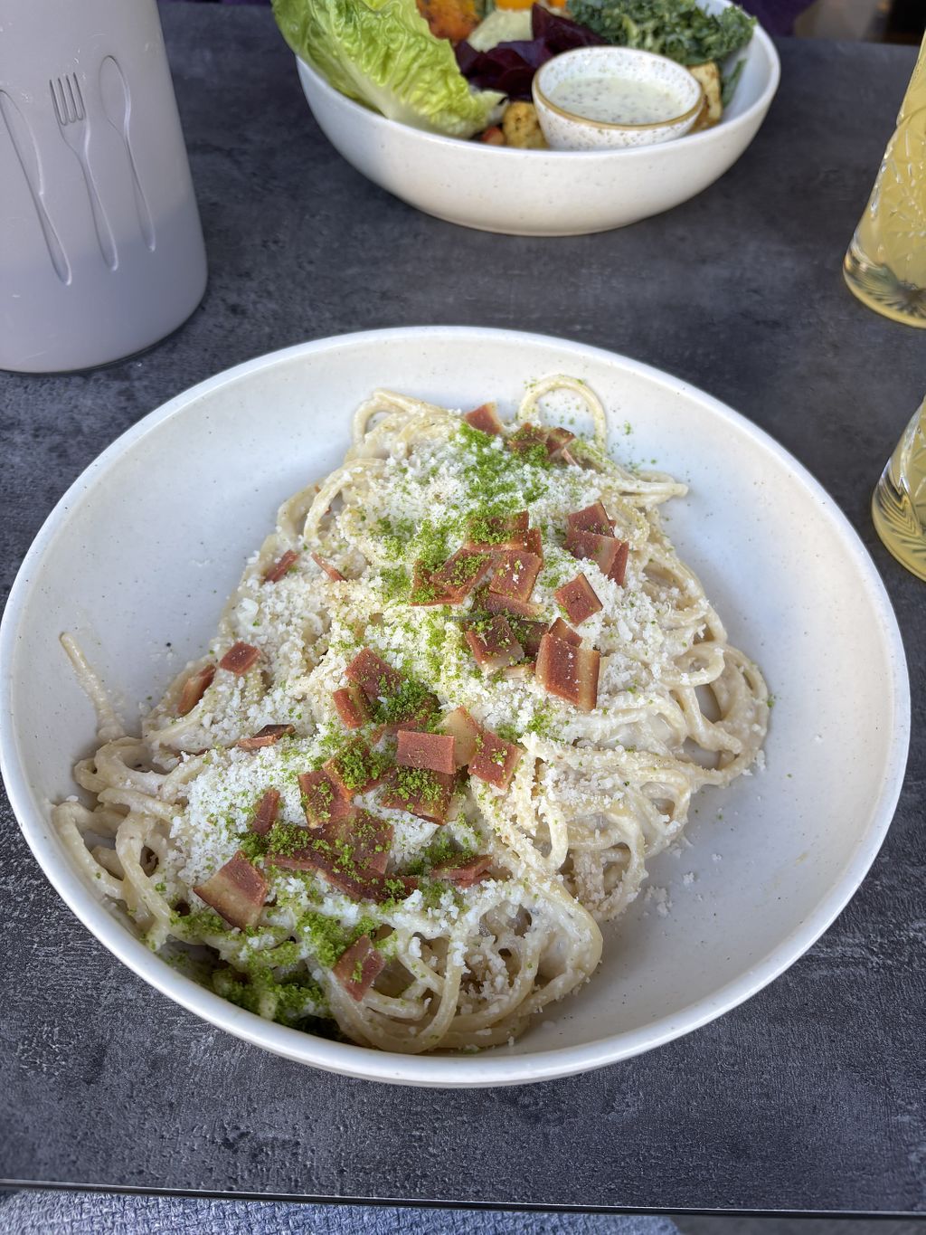 If you’re looking for fast food, Bistro Verde is not the place. Over the course of more than two hours, I was served delightful bread with dip, crispy cauliflower, spaghetti carbonara, and some of the best vegan desserts I’ve had anywhere.