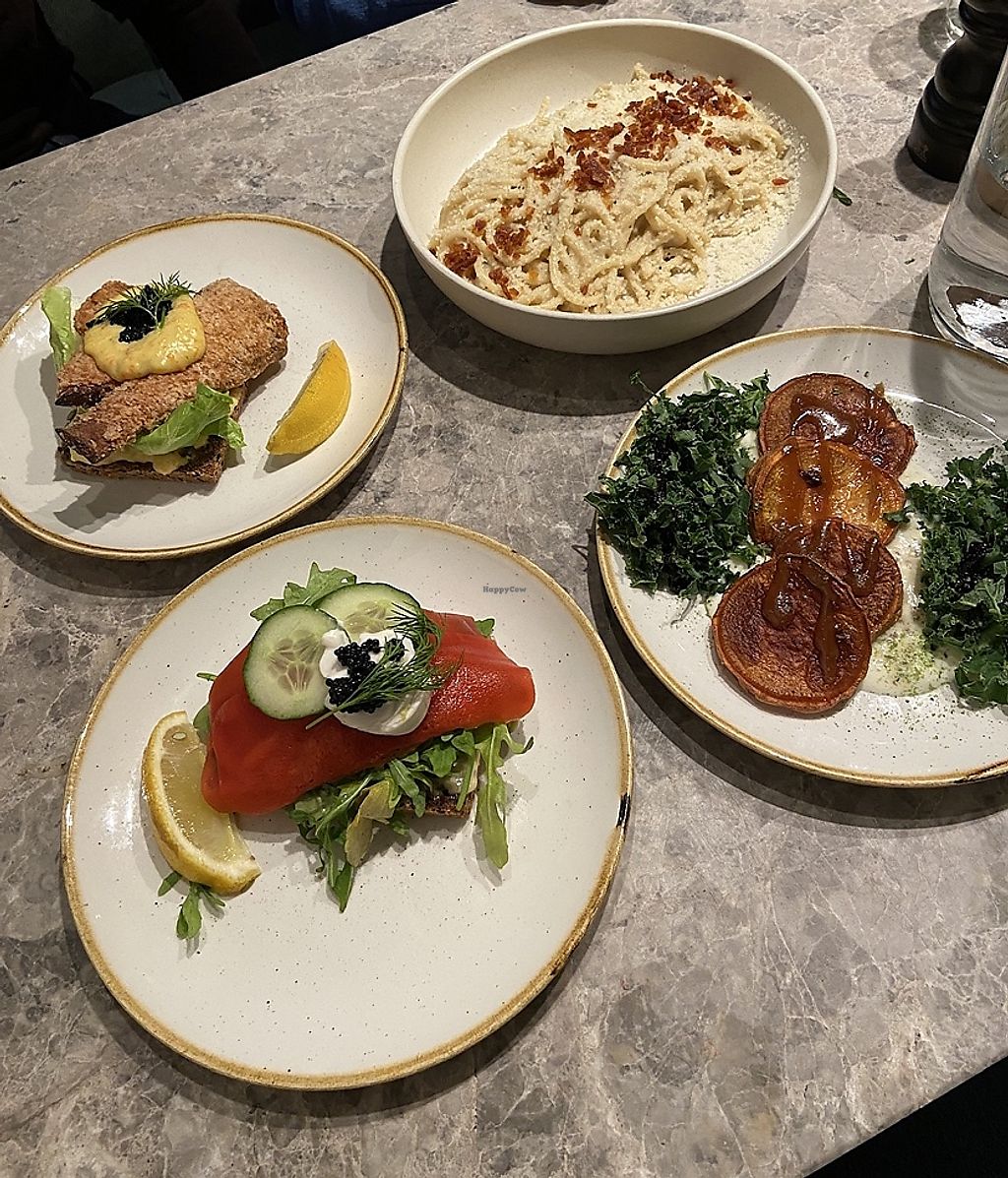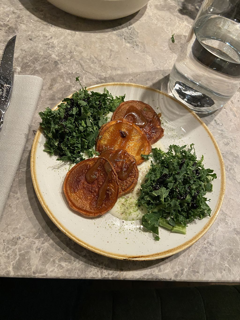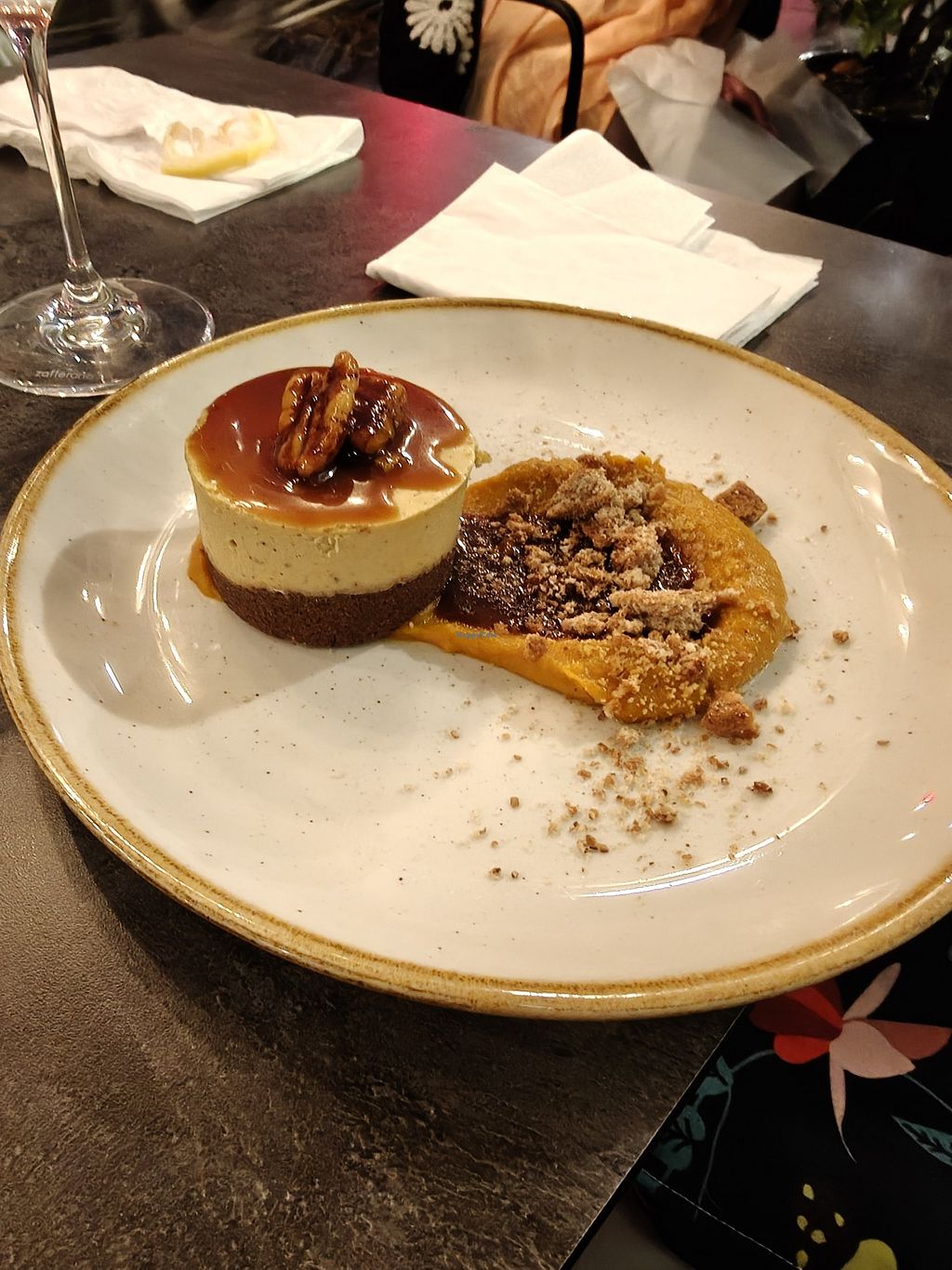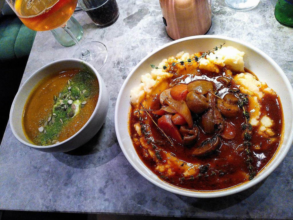 We came here once during the day for a mid-day treat (pumpkin pecan pie and smørrebrød). That was very delicious! Then we came back another day in the evening for dinner and had the pumpkin soup, carbonara pasta and mushroom/mashed potato stew. The carbonara was a bit bland and lacked flavour unfortunately. For dessert we shared a pistachio tiramisu which was good but also not wowing us. All in all very good place to eat, but there are better vegan restaurants here.