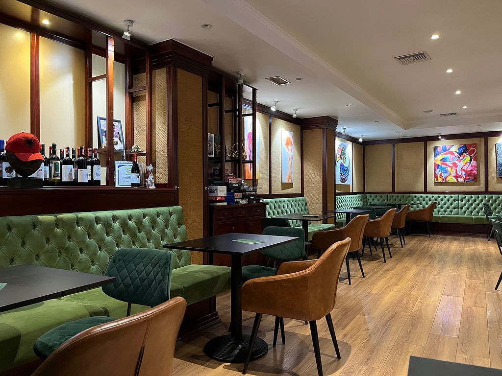 Interior dining area with plush green benches