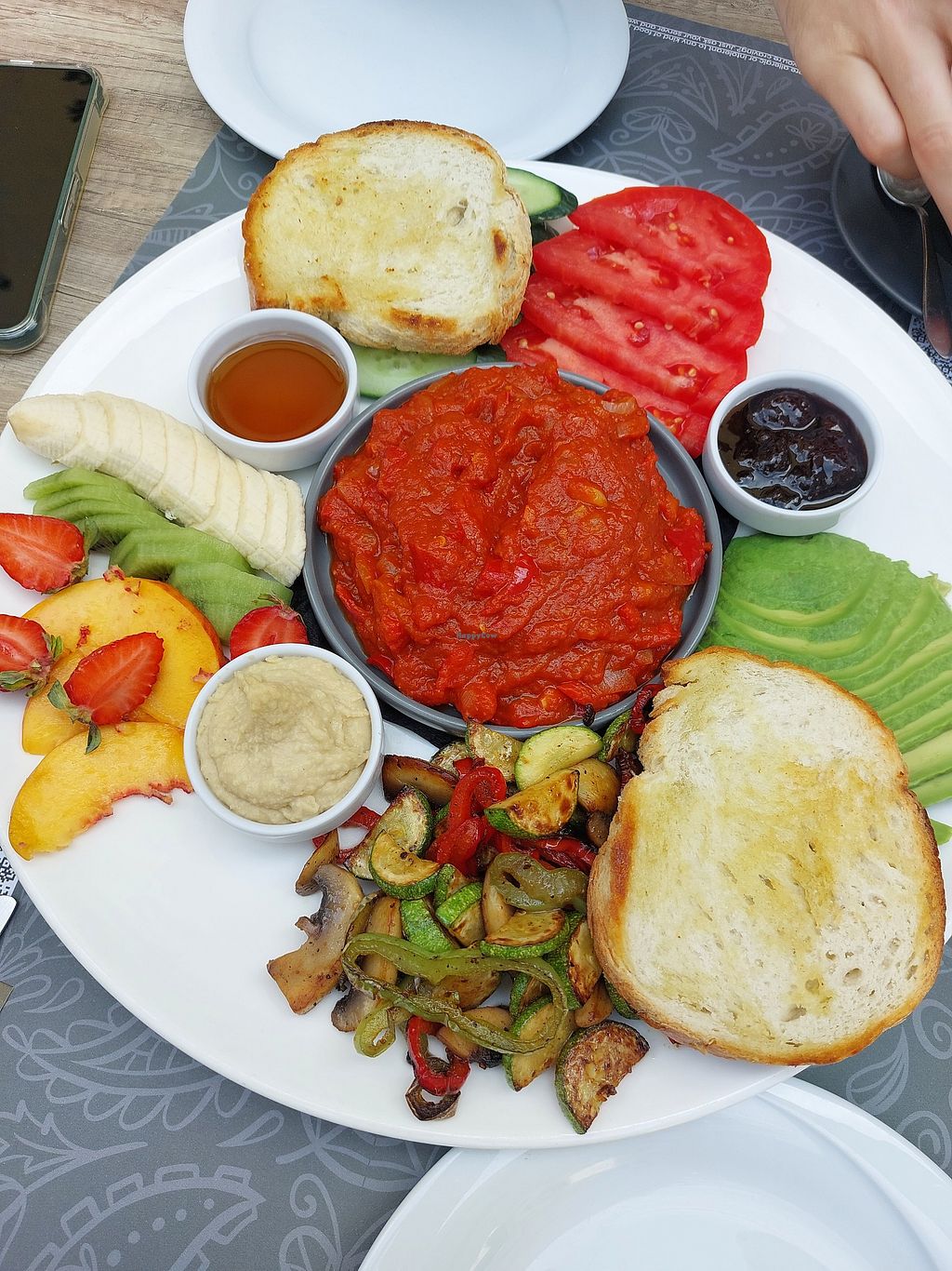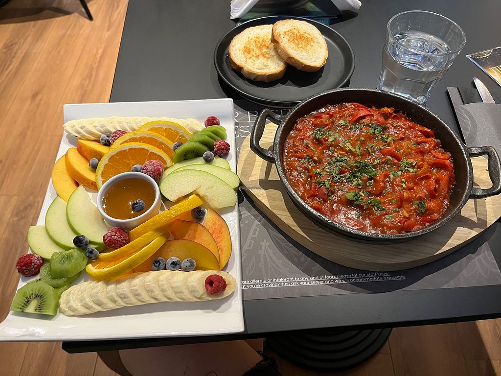 Fruit platter and vegan shakshuka