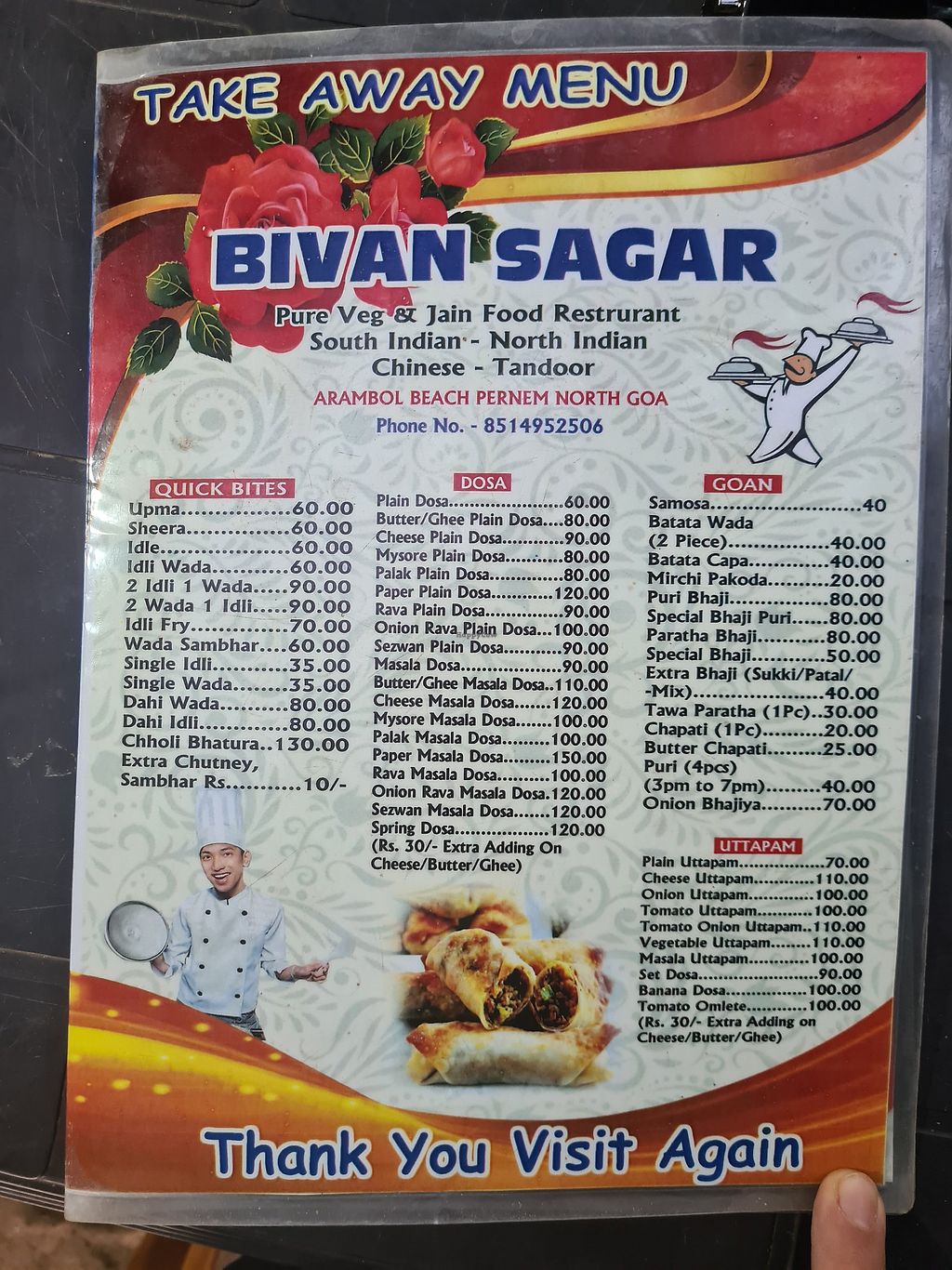 A pure veg jain restaurant on Arambol Beach. Dairy is used but no egg, garlic or onion. Ghee is sometimes used but dishes can be requested to be made vegan. Offers dosas, samosas, veg sandwich, pav bhaji, gobi manchurian, veg korma, veg hyderabadi and mushroom masala. Open Mon-Sun 9:00am-11:00pm.