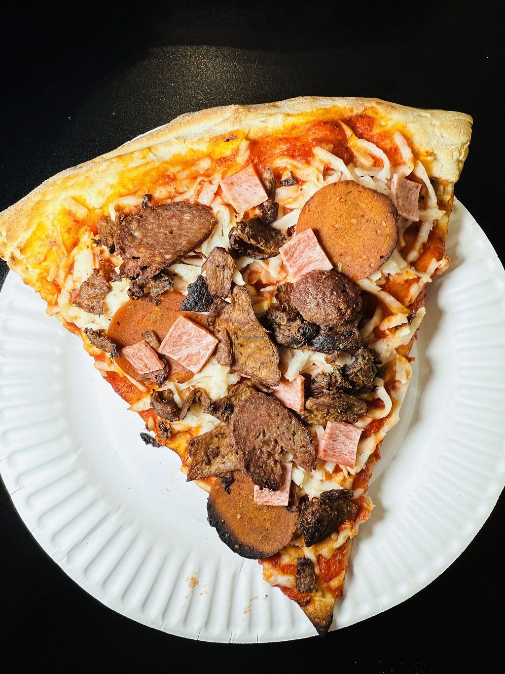 Large pizza slices with butcher’s son mozzarella. Tasty vegan meatball sub!
