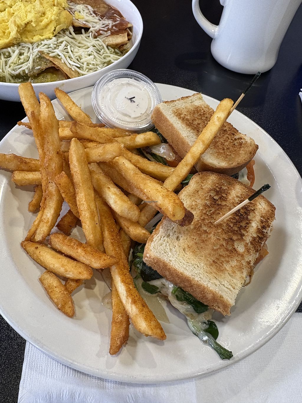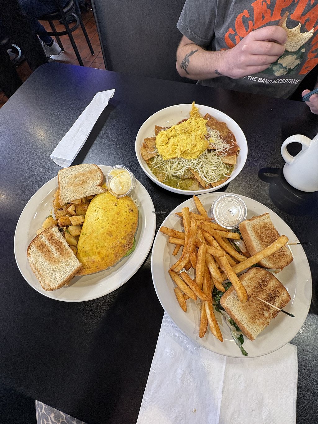 this place IS SO GOOD!! vegan options at diners are usually lacking, or like a “healthy” alternative and sometimes you just want classic diner favorites, they provide just that! The vegan menu is extensive and clearly labeled, the staff knows what is what and very helpful. the playlist is great as well! we got the chilaquiles with both red&green, the california omelette with potatoes, and the toasted caprese sandwich. all were so good.