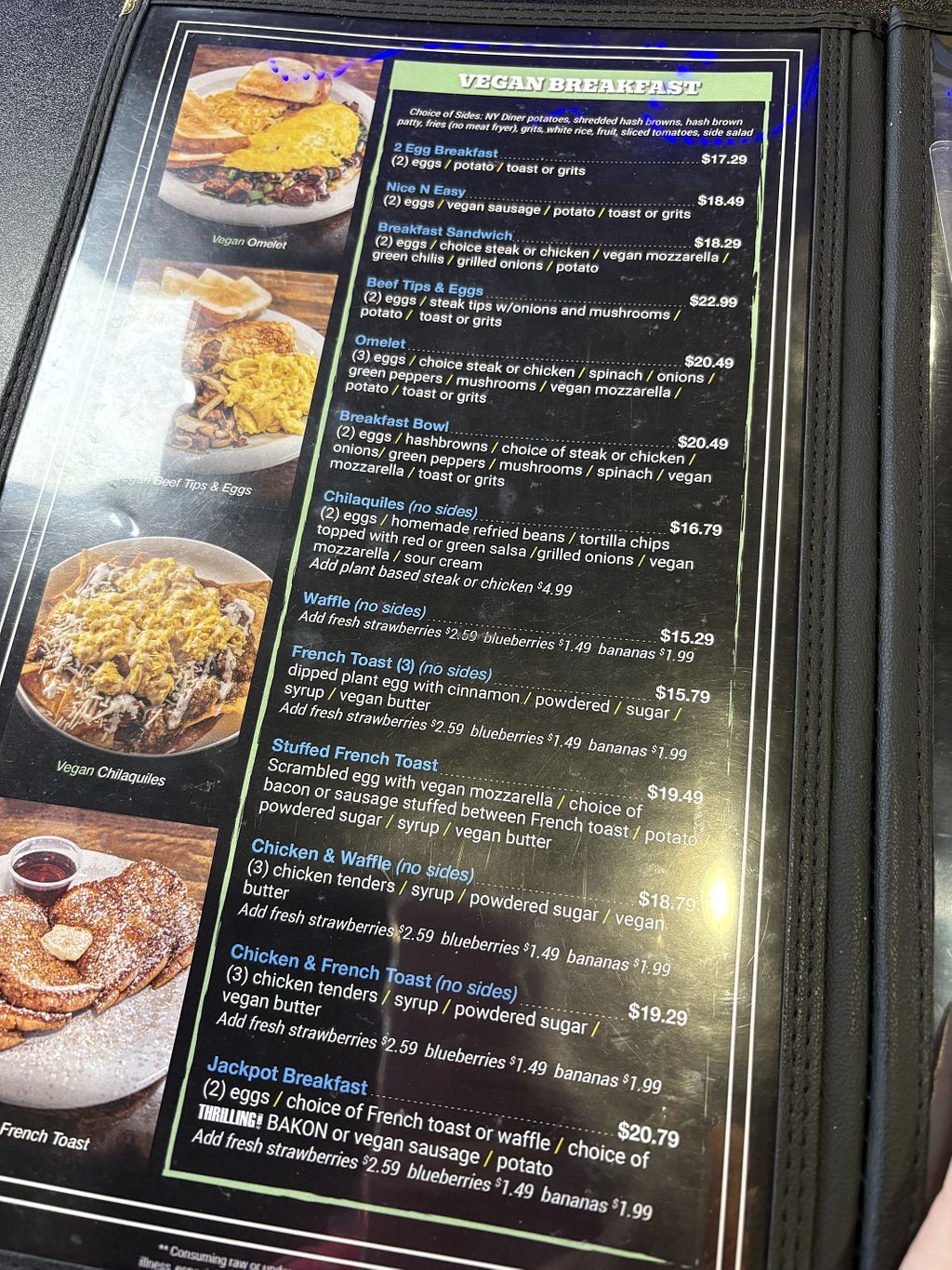 Full page of vegan breakfast options. They also have lunch options and several flavors of cheesecake.