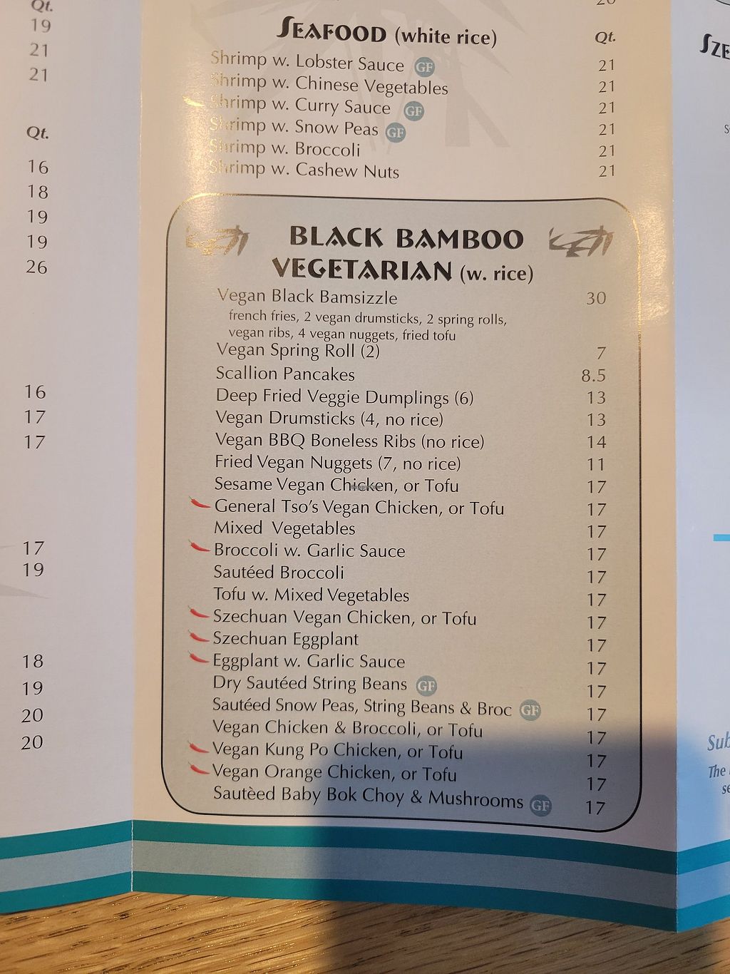 Everything was great here. There aren’t many fully vegan places in the Hartford area and there are none in West Hartford. Black Bamboo is a smaller place with only a few seats and tables but they did a tonne of carryout orders while we were there. The food we had was great and the portions were big. Items are clearly labeled and the servers very knowledgeable.