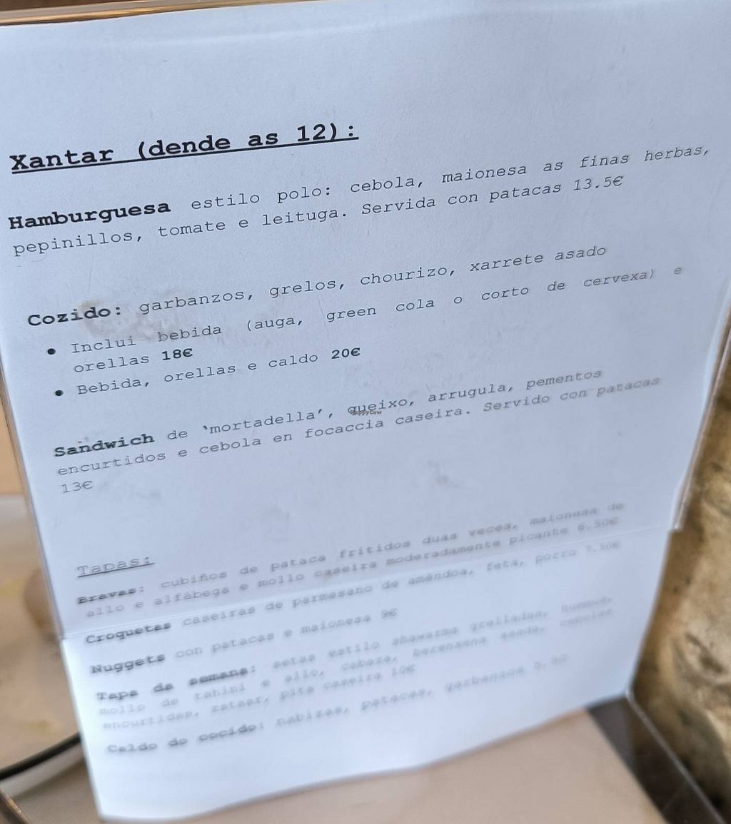 En poco tiempo se ha vuelto uno de mis sitios favoritos de Compos, con buena comida y buen ambiente. Para una persona, puedes desayunar ligero por menos de 5 euros, o si prefieres algo más contundente por menos de 10. Las comidas, aún eligiendo carta en vez de menú, no suelen llegar a los 15 euros por persona.