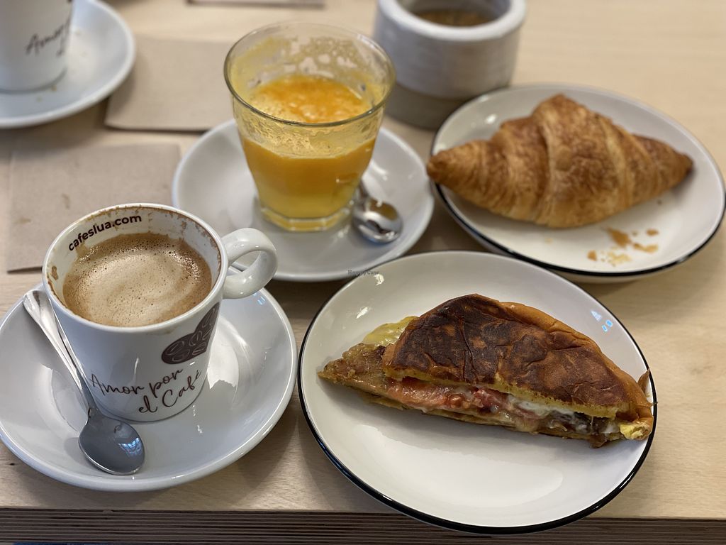 We arrived around noon but I think it was still the breakfast menu. The omelet sandwich was good. Fresh orange juice, coffee, etc. It is a nice respite from the crowds and only 10 min walk from cathedral after Camiño. Staff speak English and friendly.