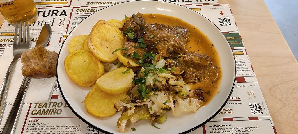 Filete de soja con patatas, setas y verduras