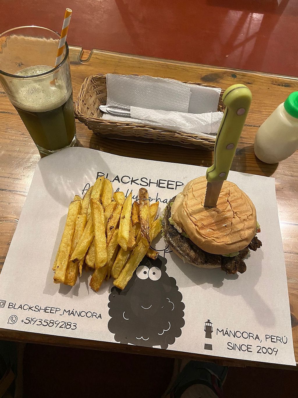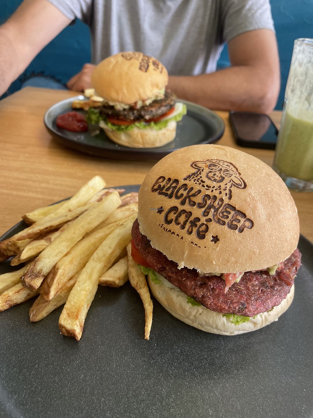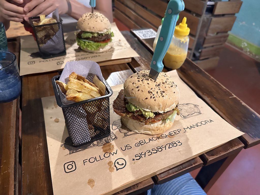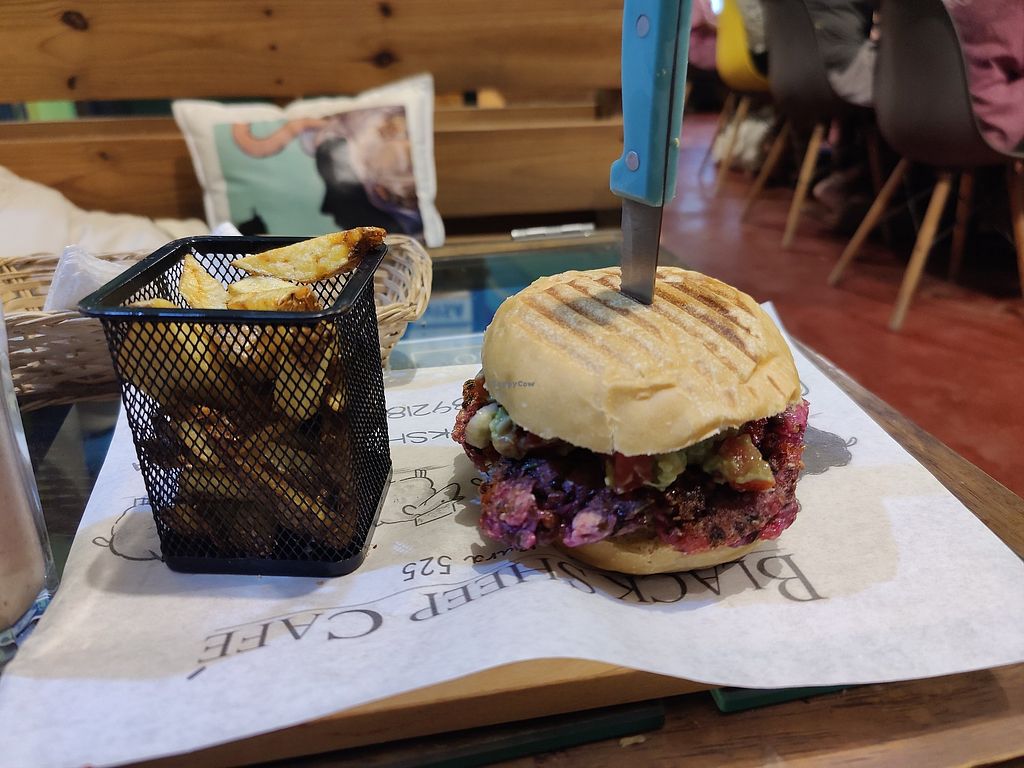 Black bean burger and fries