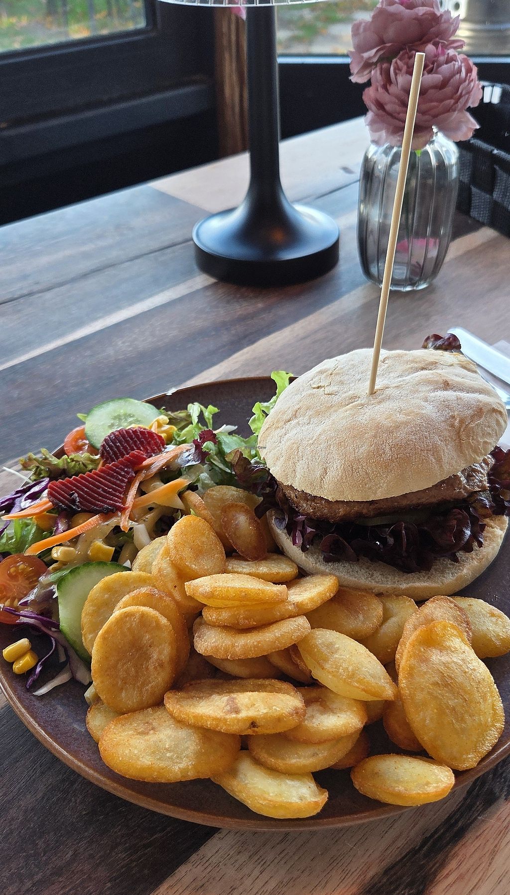 Leckerer Beyond Meat Burger, optional mit Pommes oder Chips.
