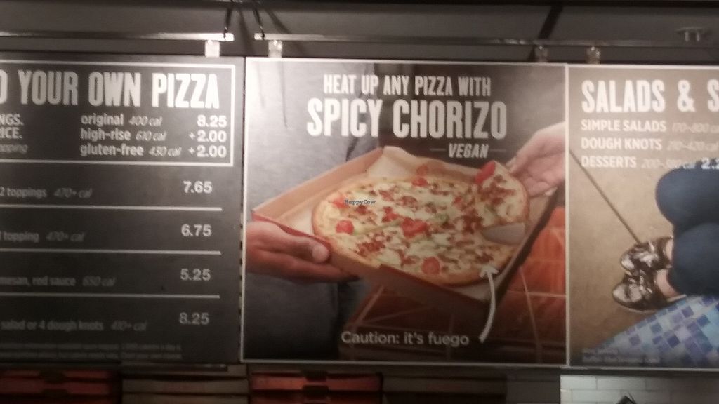 Serves meat, vegan options available. Assembly line concept pizzeria chain offering build-your-own personal size pies. Has vegan cheese, soy chorizo, gluten-free pizza base as well as salads. Choose a pizza base, sauce (marinara or hot red), veggies and toppings, and cheese, or get the pre-designed vegan pie. Reported that select locations offer a soy-based popcorn "chicken." The cinnamon bread is vegan by default. The cheesy bread needs to be ordered with the vegan cheese option. Open Mon-Sun 10:30am-10:30pm.