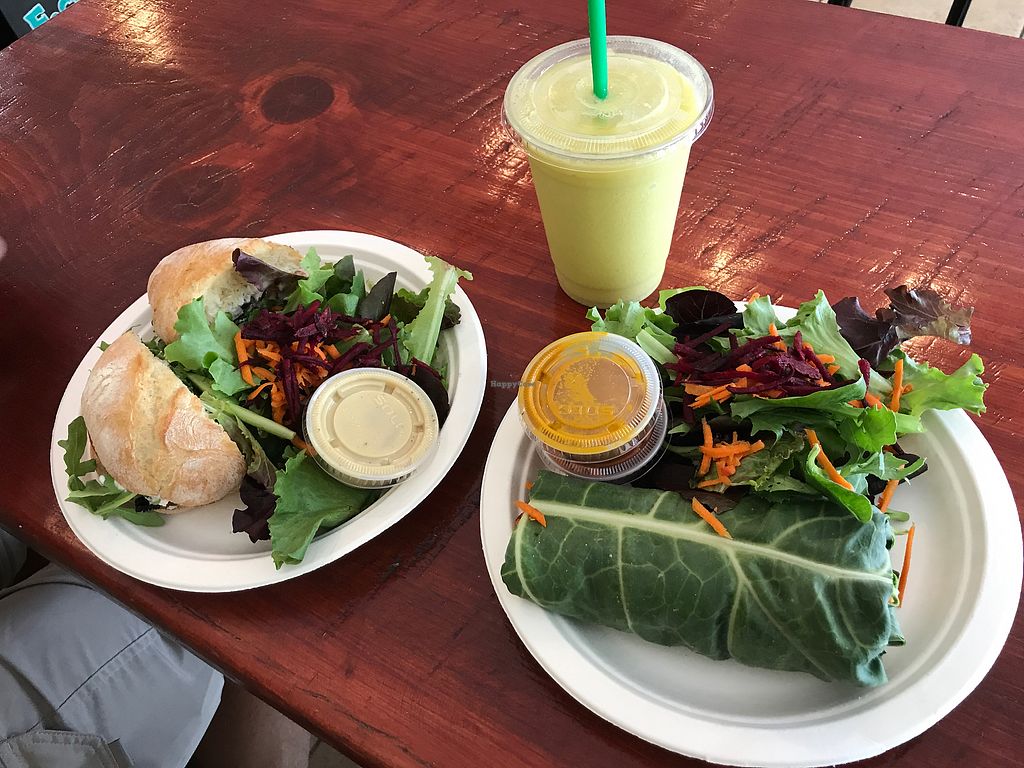 Serves meat, vegan options available. Green smoothies and sandwich cafe. Reported closed, May 2018.