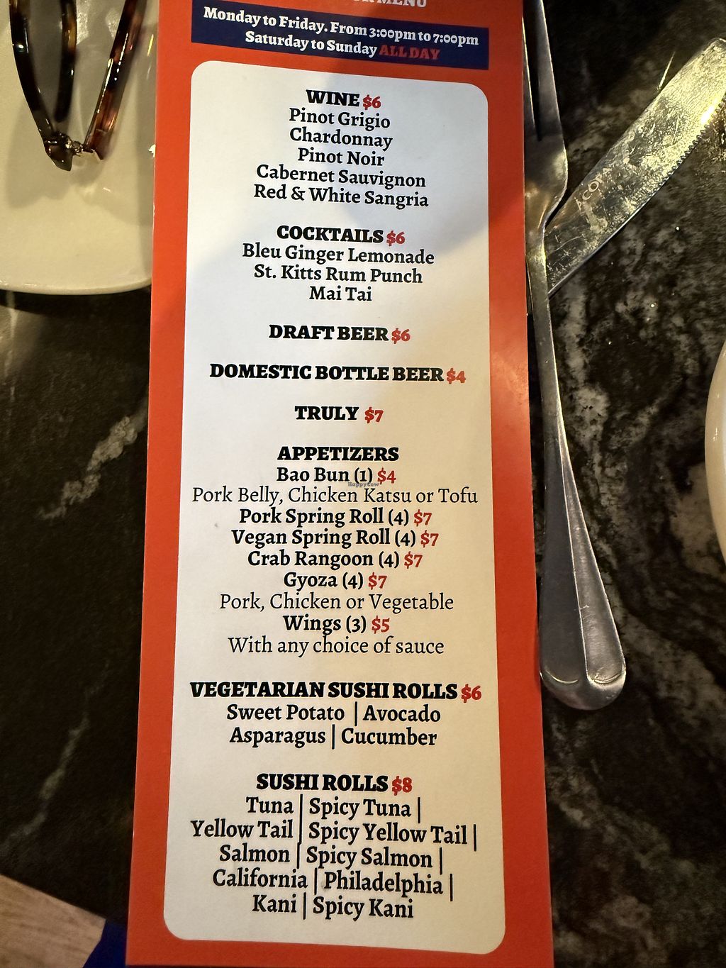 S&P was booked so decided to try this place. Walked right and ate at the bar for happy hour specials. My tofu boa bun and asparagus roll were fantastic. Not hungry enough to try the vegan spring rolls. Grateful for a place with options! Service was really nice too. Thanks!