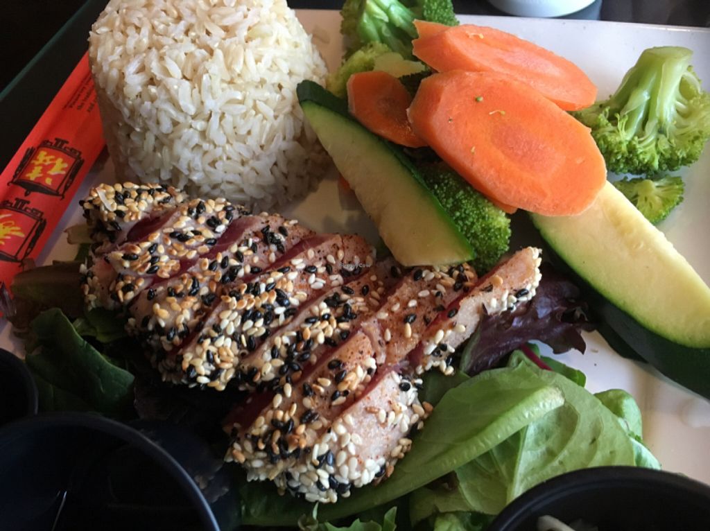 There were a bunch of vegetarian options. Fancy restaurant feel with $14-30 price range. Great service and tasty food. My partner got a garden burger and added grilled onions and green chilies with the sweet potato fries and loved it. I got the seared ahi tuna with ginger rice. Presentation was beautiful and tuna was delicious but veggies were plain. We would definitely come back next time we're driving through!