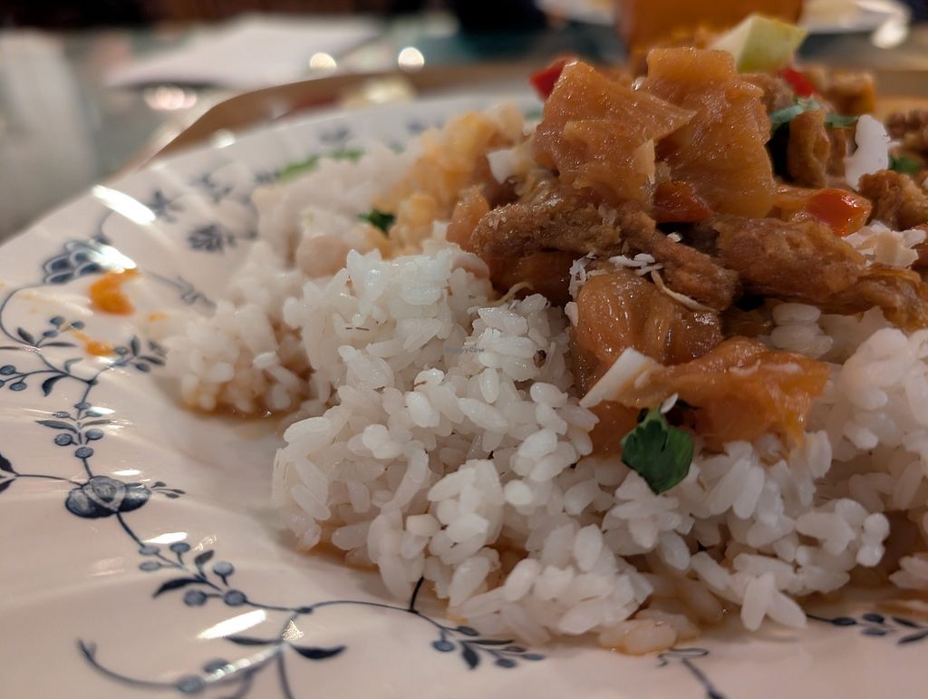 The food was delicious and wholesome! Definitely the best vegan “chicken” I’ve had (chicken mole with beans), and a very flavorful Thai pineapple coconut curry. The selection of books and art were sublime, as well😄