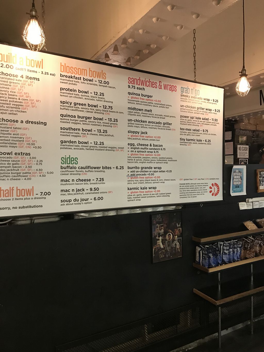Fast food version of Blossom Restaurant, billed as "shrewd fast food." Takeaway style. Menu offers vegan wraps, burgers, salads, raw pizza, raw burrito, soups, fresh juices, smoothies, and sweets. This outlet est. 2016 in the underground foodcourt concourse of the Columbus Circle subway station between 57th and 58th St. Reported closed, Aug 2019.