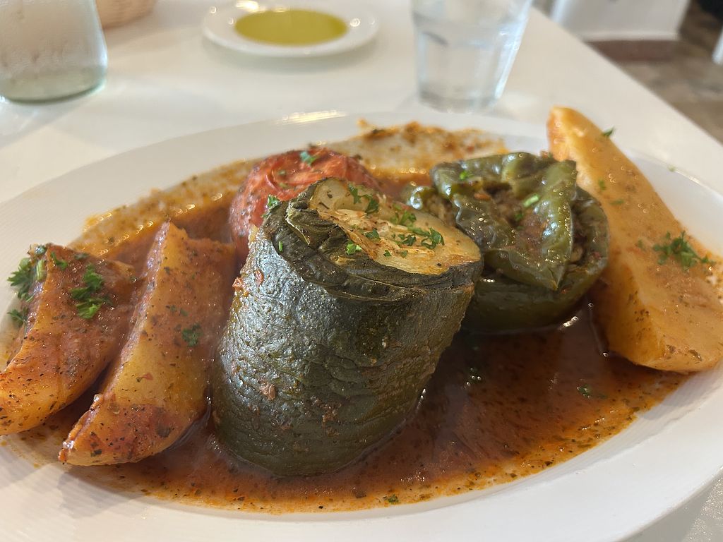 Cute restaurant with outdoor seating with many clearly marked hearty vegan options. Tried the fantastic lettuce salad, yummy hummus dip, gigante beans and very large vegan stuffed grilled vegetable entree (Gemista). Everything was very tasty. Lots of left overs too.