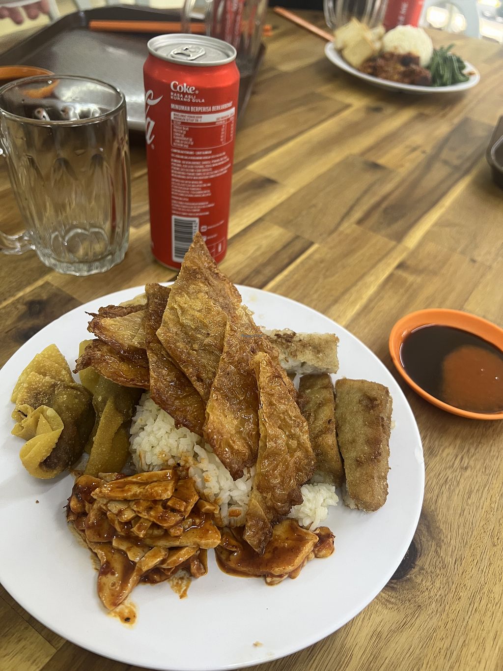 We walked up to this place and the outside looks a little run down, but it was super busy loads of people in there. The staff were very nice, helped us. We got the rice with 3 dishes, the char sui porkless was amazing, and the potato rendang one too. We both got meals and drinks for RM 30!!