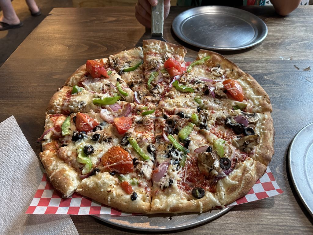 Vegan cheese upon request (not listed on menu). Fresh ingredients and fun atmosphere. Vegan cheese is not heavy on the pizza, my daughter who doesn’t normally like vegan cheese liked this pizza.