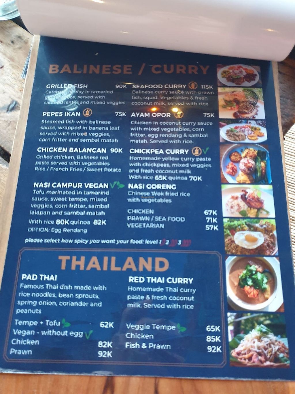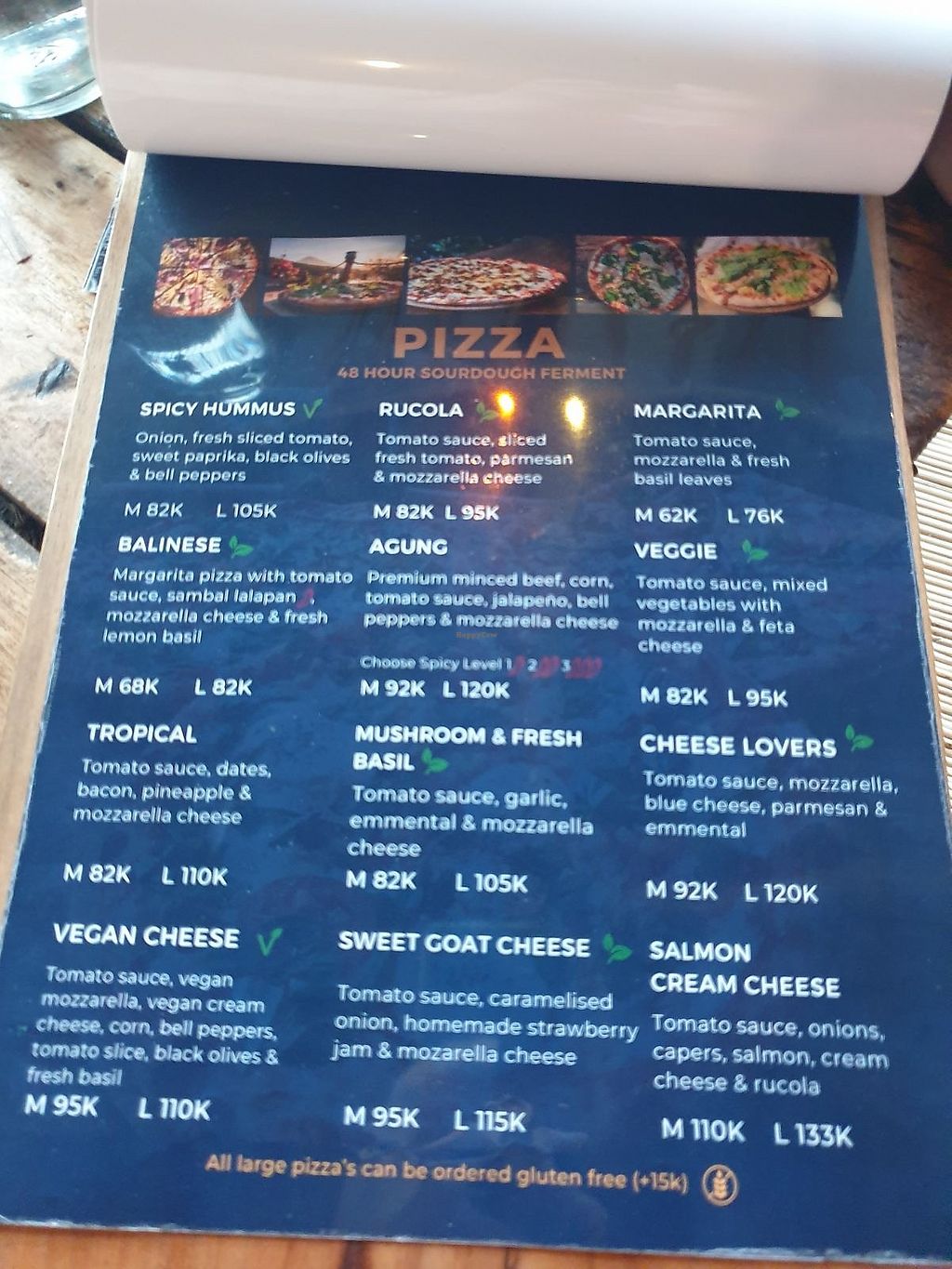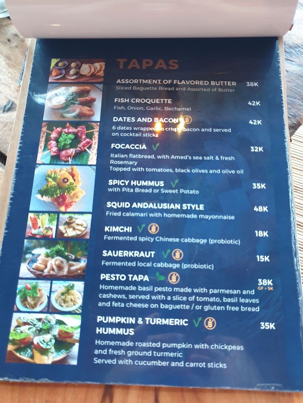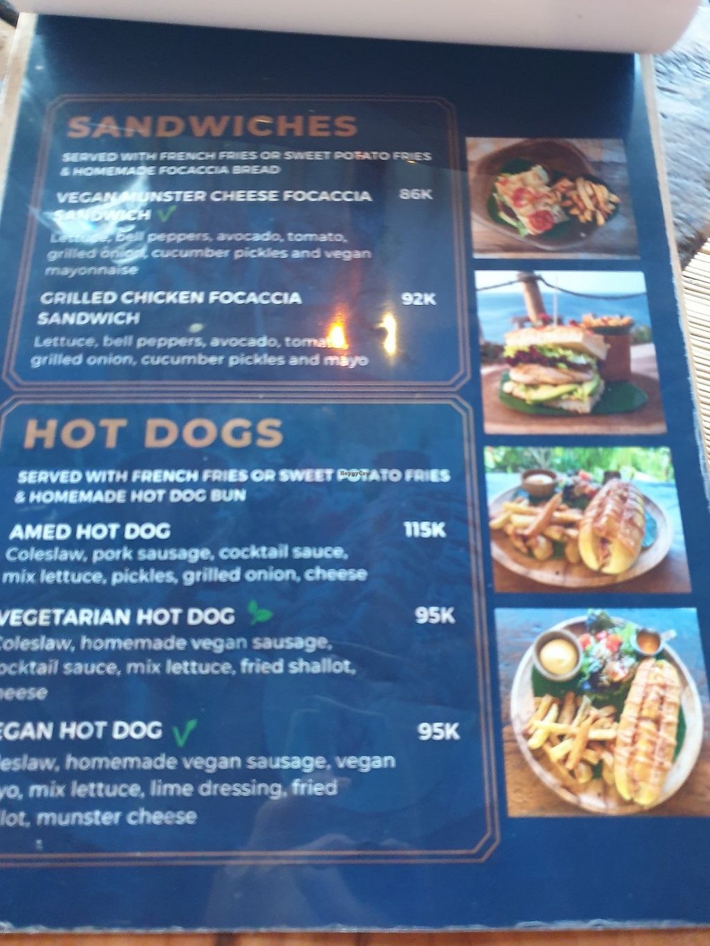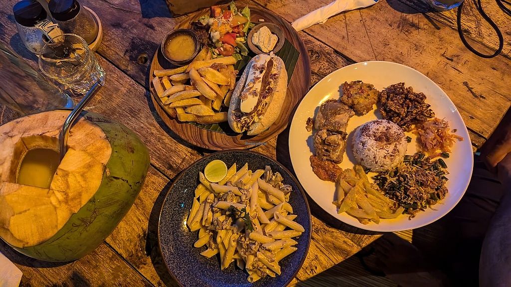 Vegan dog 95k, Nasi campur 80k, Mushroom pasta 60k