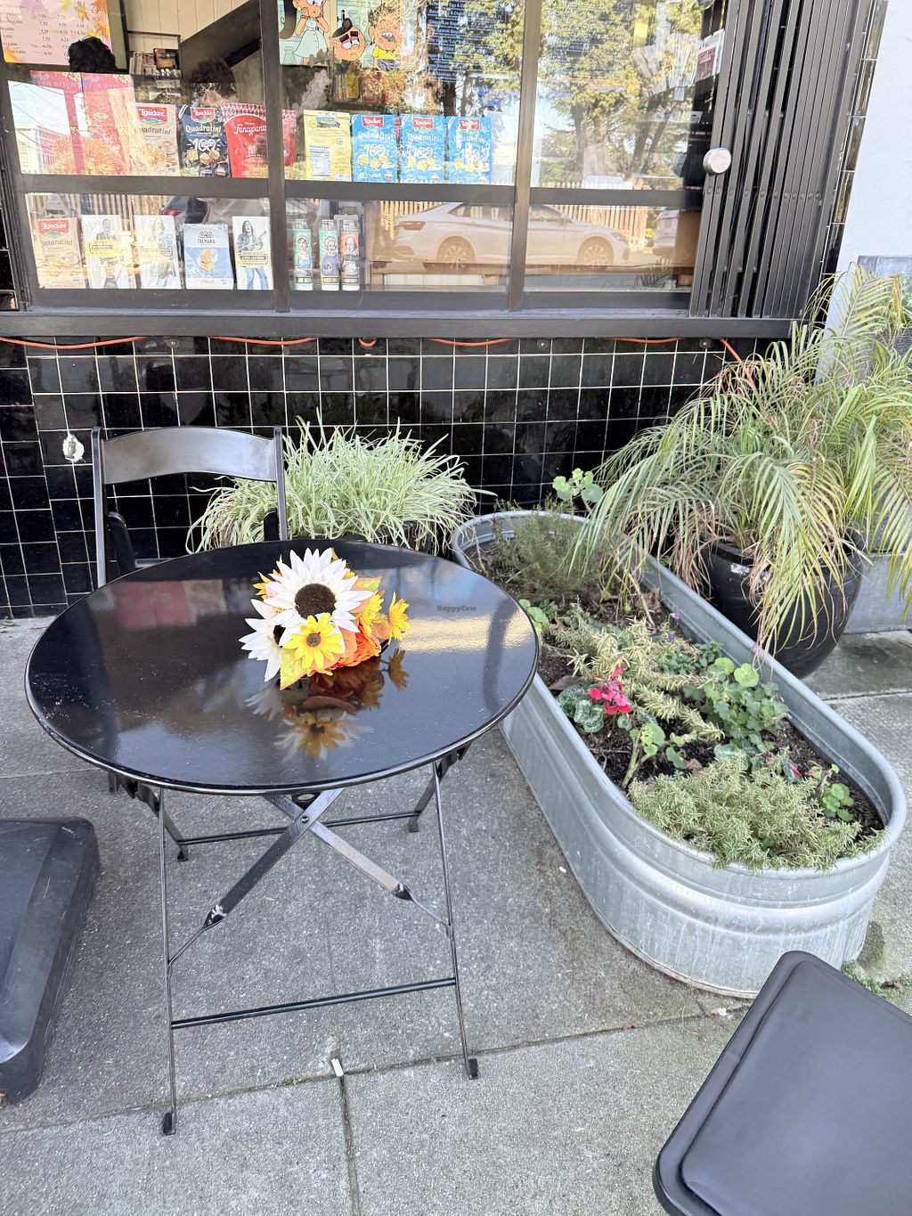 Small city corner supermarket, limited but lovely outdoor seating with fountain facing a park. 3 items on the menu labeled vegan, featuring just egg and beyond sausage. Tasty, fresh. Definitely recommend!