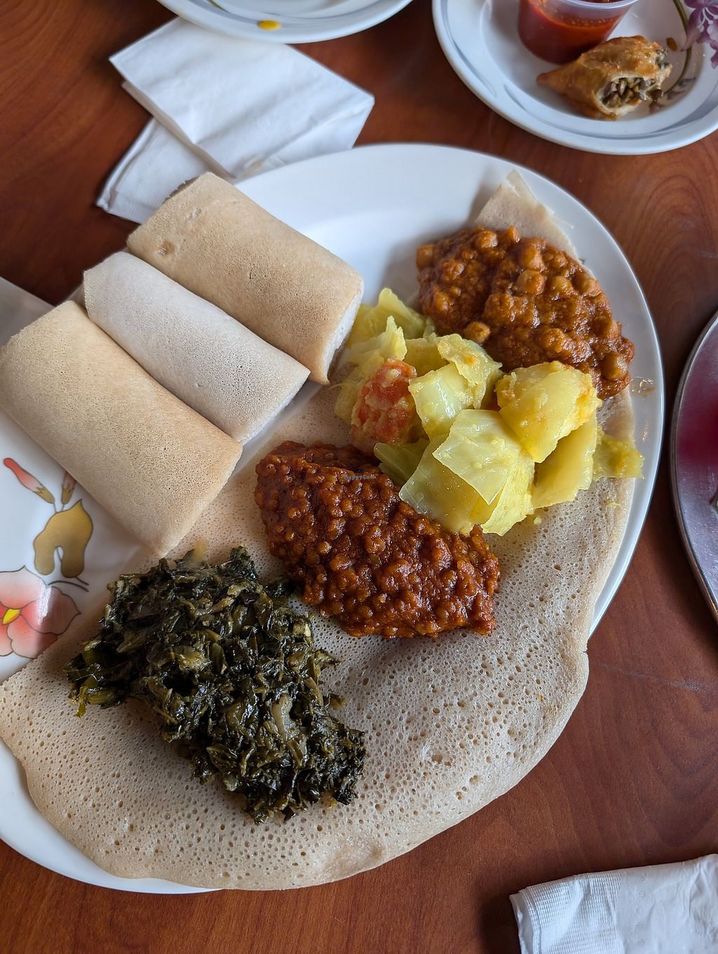 I had a veggie sambusa (very tasty), and ordered the veggie combo. I asked for recommendations for which items to include. Our waitress recommended her favorites: Gomen, Fosolia, Inguday Watt, and Shimbera Watt. Everything was excellent, and I ended up with enough leftovers for lunch.