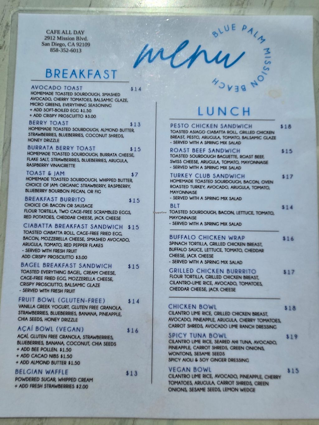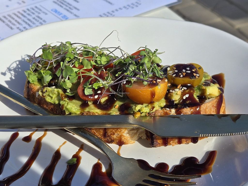 Serves meat, vegan options available. Beach cafe offering vegan choices such as a vegan bowl, avocado toast, smoothies, peanut butter & jelly sandwich and salads that can be made vegan. Also has plant-based milk alternatives for drinks. Open Mon-Sun 7:00am-3:00pm.