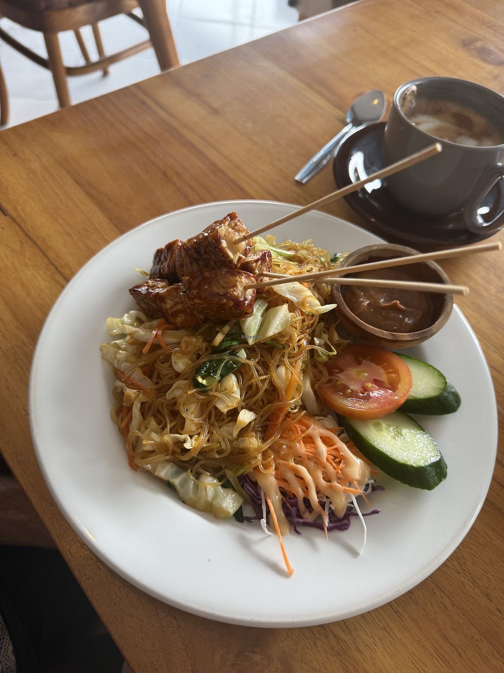 Serves meat, vegan options available. Indonesian restaurant serving local dishes and Western dishes. Vegan options include mie goreng, nasi goreng, gado gado, and drinks made with oat milk. Open Mon-Sun 8:00am-10:00pm.