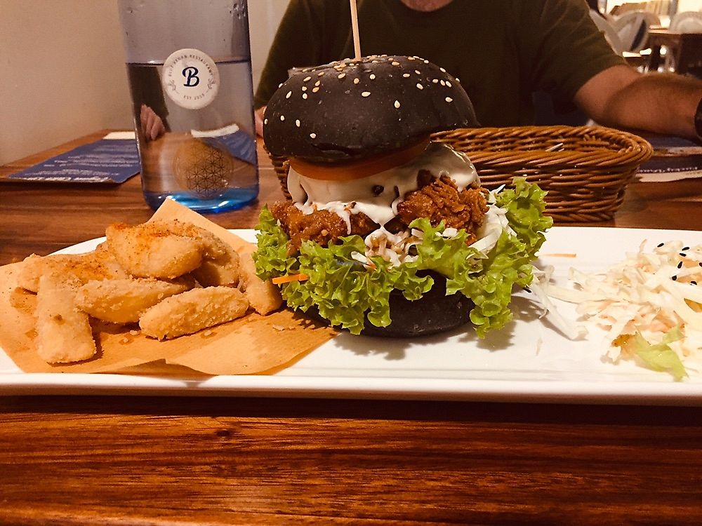 Probably the best vegan meal we have EVER had. We got the black magic burger which was truly magical, as were the chips that came with it, and the basil pesto pasta which was super tasty and a huge portion size 💪🏼 We also had to try the popcorn mushrooms that were coated in a really crispy, slightly spiced batter and the panggang tempeh, both dishes blew our minds with flavour!! Worth every penny.