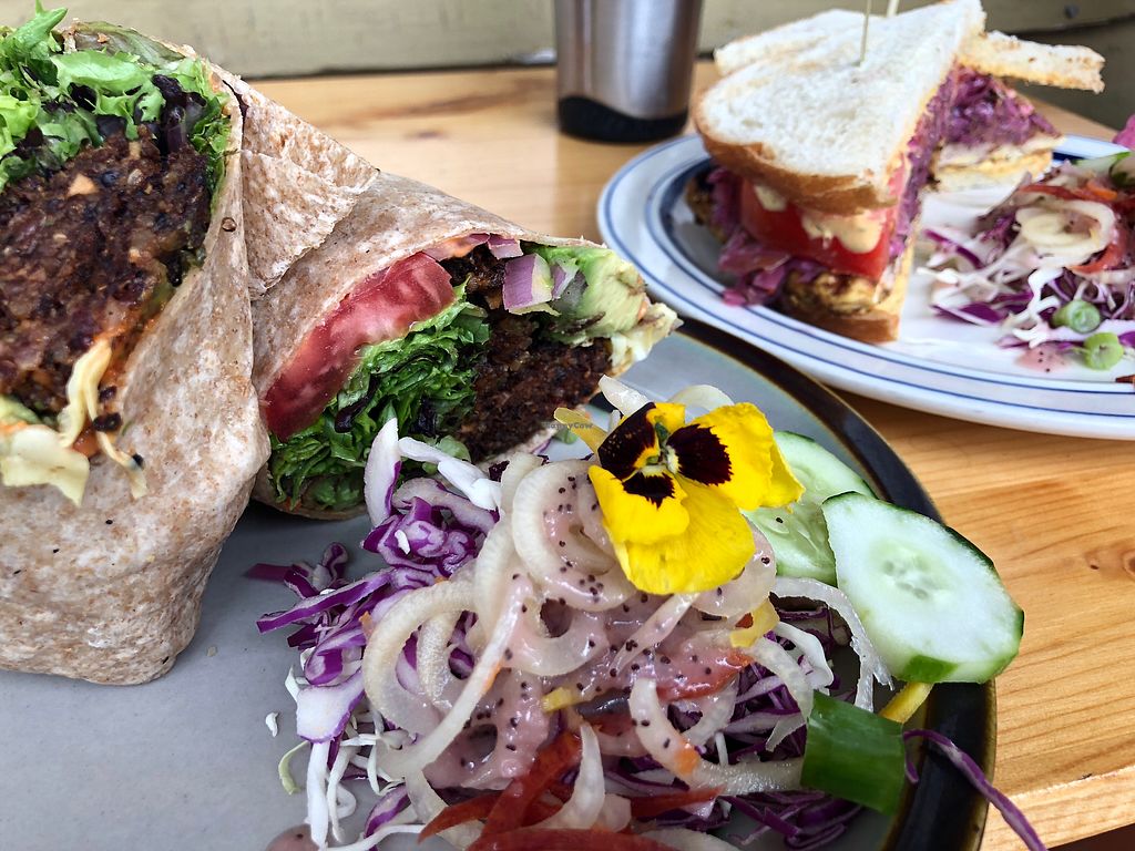 Read moreEverything is vegetarian & most items are vegan or have a vegan option. My husband throughly enjoyed his Cali Wrap, as he loves the avocado which was a key ingredient. I thought my Ruebenesque sandwich was one of the all-time best sandwiches I've ever had - before or after becoming vegan! It was a very loose variation of a Reuben sandwich made with tasty grilled tofu, a red cabbage "sauerkraut" (tasty & not so very sour) & a wonderful dressing. No cheese. The sandwiches came with a pretty garnish of raw veggies that we also enjoyed. The only portion of our lunch we did not gobble down was the onion soup, which was a bit oily for our "no-oil" palettes. The Soup was incredibly tasty, however, so is oil is a part of your daily eating patterns, you'll love it as well.