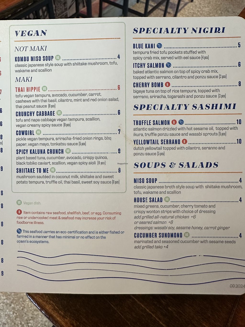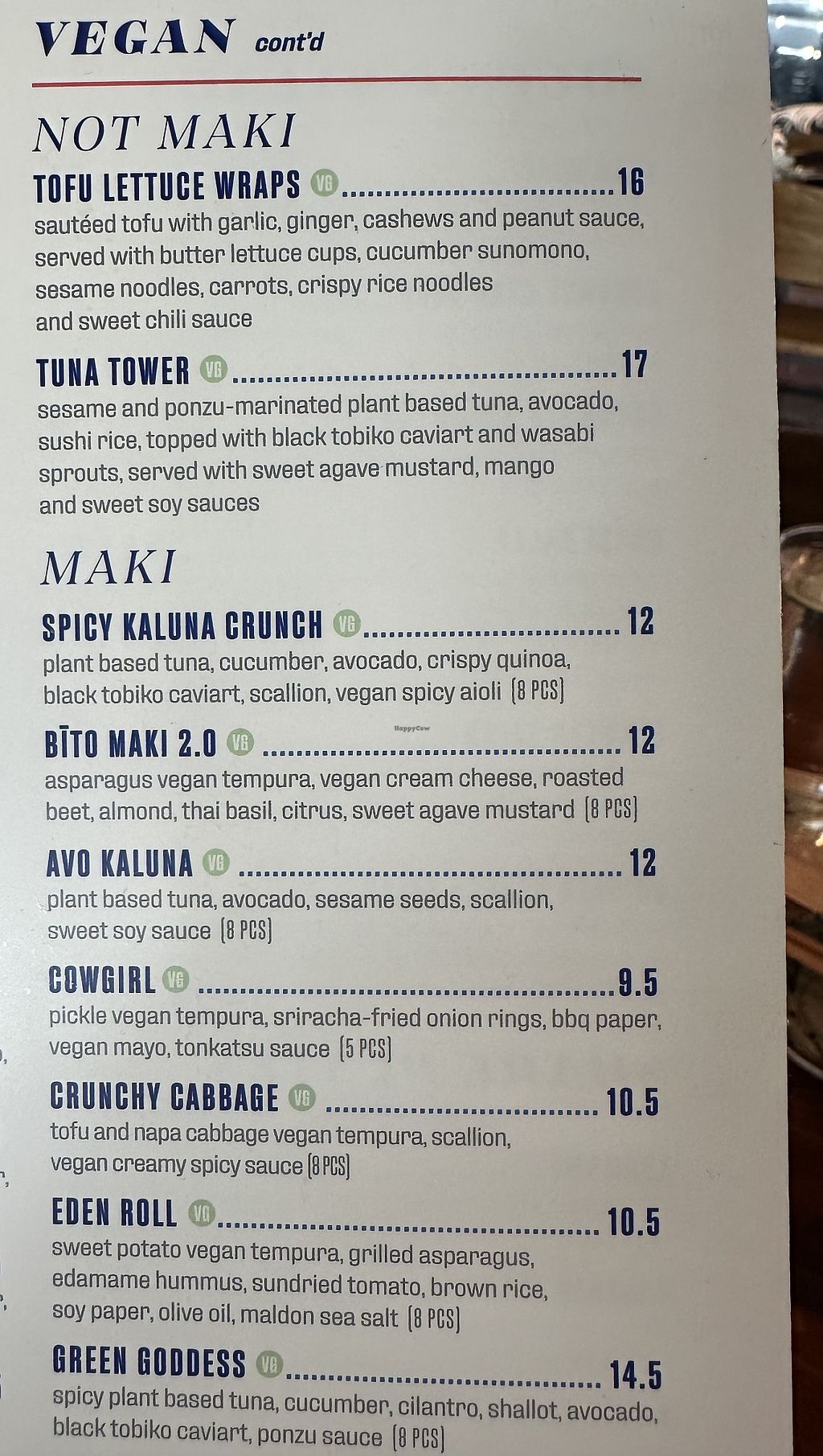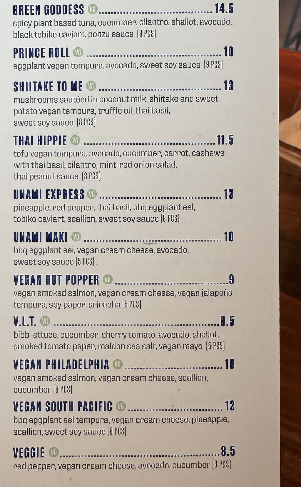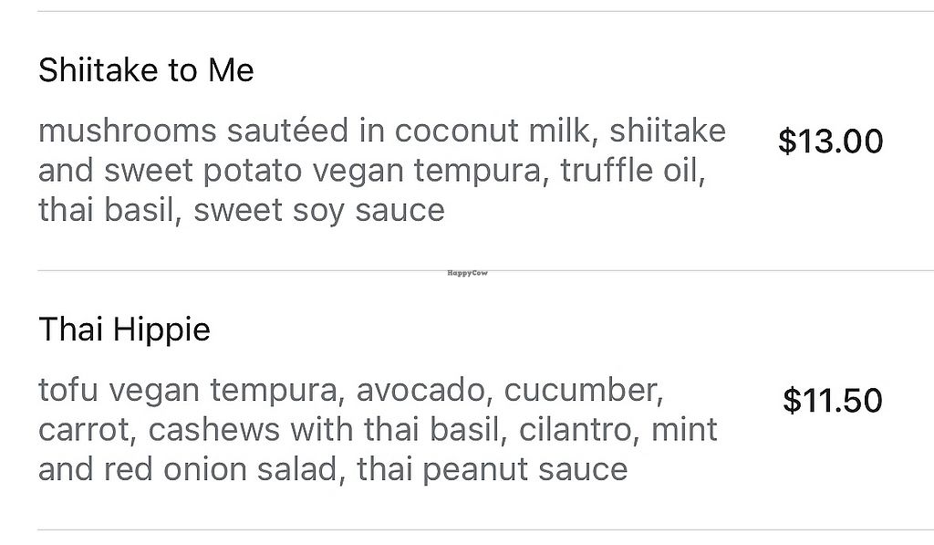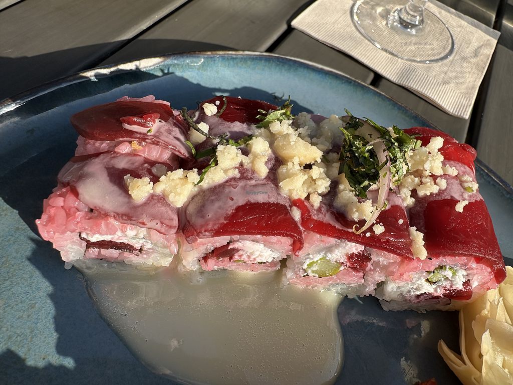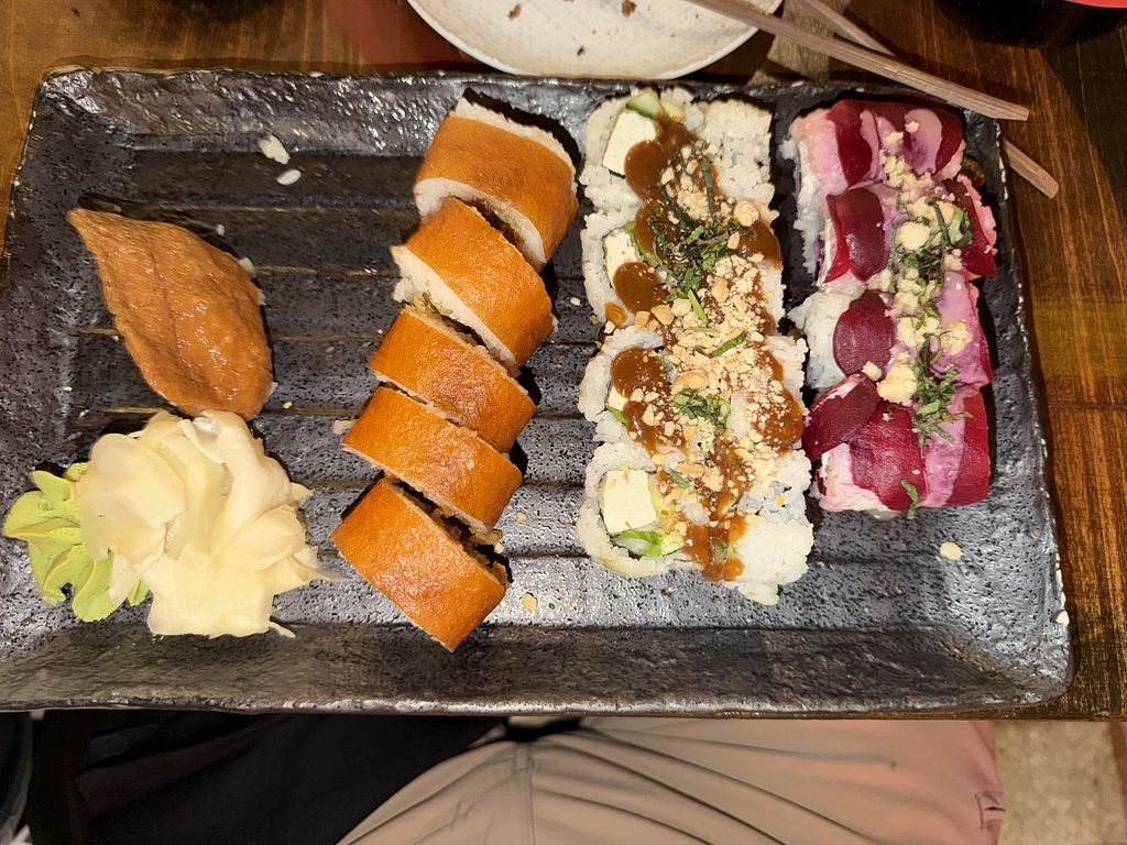 Incredible, super creative options for vegans. I love the use of mushrooms, beet, Thai basil, plant based eel salmon and tuna, etc. The Maki rolls I have had are so flavorful that you don’t need soy sauce. So much better than most vegan sushi!
