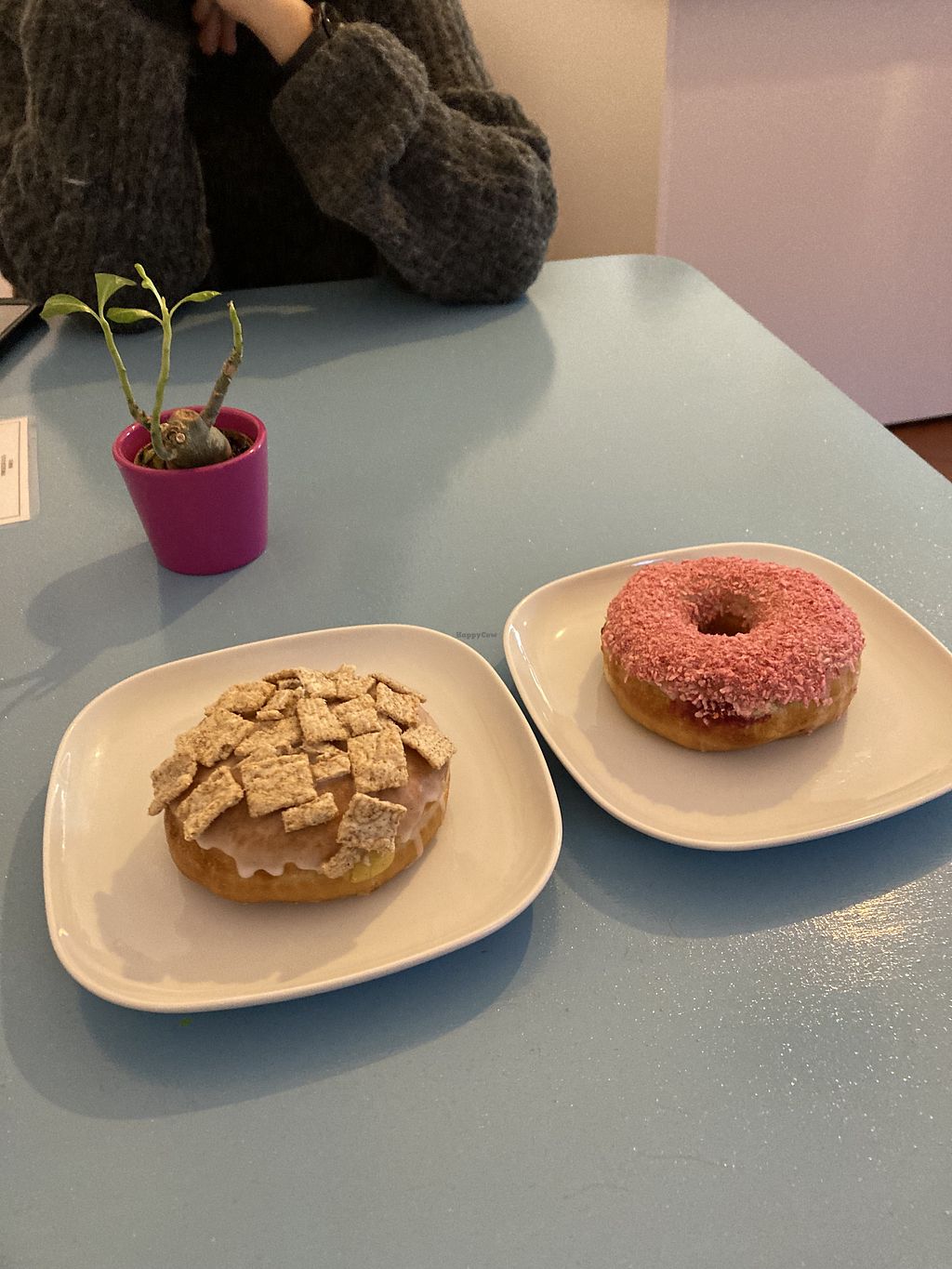 We walked a long way to try these donuts, and they were definitely worth the walk! We tried the Raspberry ring donut filled with jam and vanilla, and the Cinnamon donut filled with vanilla, along with a lovely flat white each. We eat a lot of donuts, and these are definitely at the top of our ratings! #Veganuary