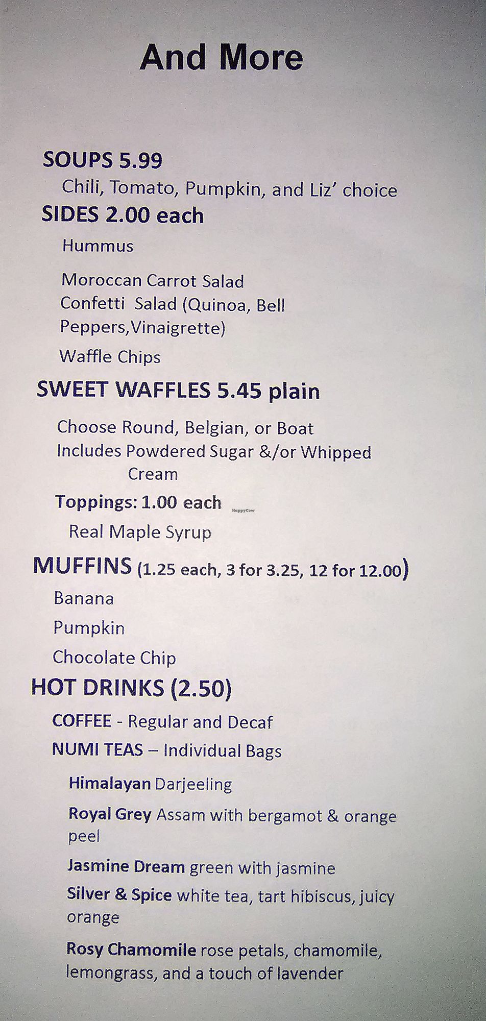 Serves meat, vegan options available. Quick service gluten-free eatery offering waffles, sandwiches, salads, cold drinks, shave ice, hot drinks and muffins. Default menu options are vegan but non-vegan items can be added. Facility is also soy-, egg-, and nut free. Confirmed closed August 2018.