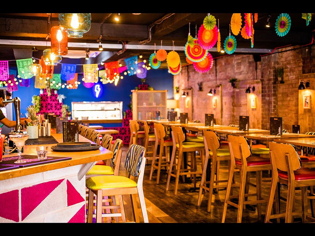 Serves meat, vegan options available. South American inspired restaurant and cantina bar. Has a separate vegan menu with dishes like frijoles (black beans cooked with garlic, roasted cumin seeds, chili), burritos, tacos, and nachos. Range of alcoholic beverages from South America. This branch confirmed closed, Jan '20.