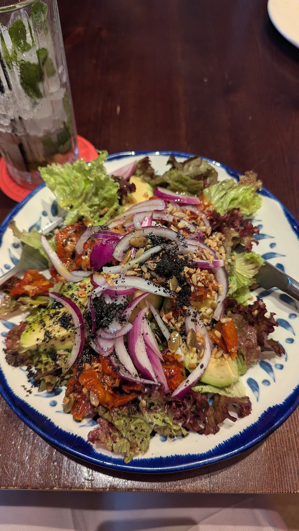 The vegan salad is huge and perfect for sharing or eating as a main meal. It has tons of dark leafy greens and is covered in olive oil. It has seeds, onions, sun dried tomatoes, and large amounts of avocados mixed in. It is so fresh and refreshing. There is seasoning on top as well that is a mix of some black pepper and other things. It isn't spicy, but adds to the flavor. I love this salad. I want to make it at home after being inspired by this place.