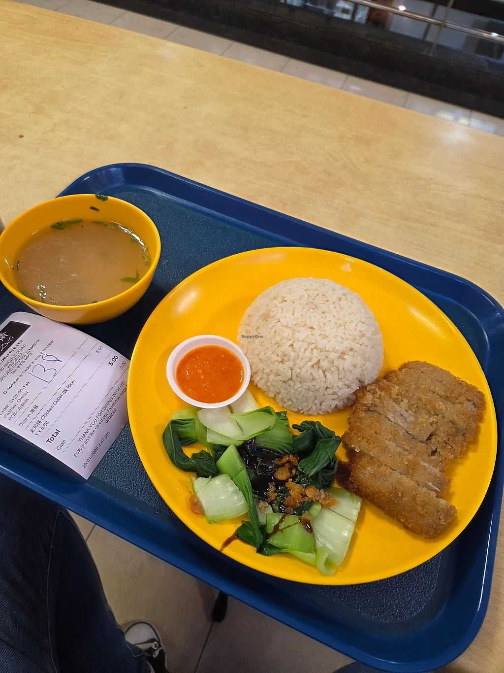 Amazing vegan chicken cutlet with noodles. Tasty and affordable. Located on the third floor.